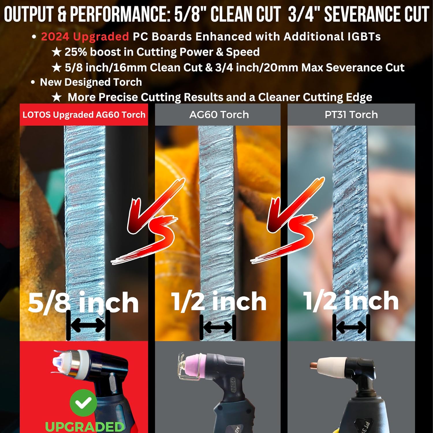 - โ ๐๐๐๐ ๐๐ฉ๐ ๐ซ๐๐๐๐ ๐๐จ๐๐๐ฅ: 5/8-inch (16mm) Clean Cut, 3/4-inch (20mm) Severance Cut, Newly Upgraded PC board, Remarkable 25% Increase in Cutting Power compared to other standard 50-amp plasma cutters.