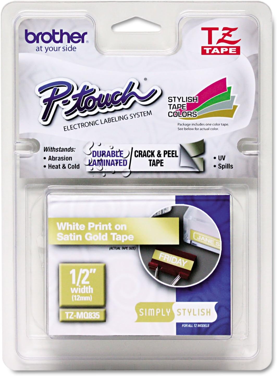 - Packaged Quantity: 1 Each, Product Type: Label Tape, Media Width: 15/32", Media Length: 16 2/5 ft, Print Technology: Thermal Transfer, Color: Satin Gold, Color: White, Material: Plastic