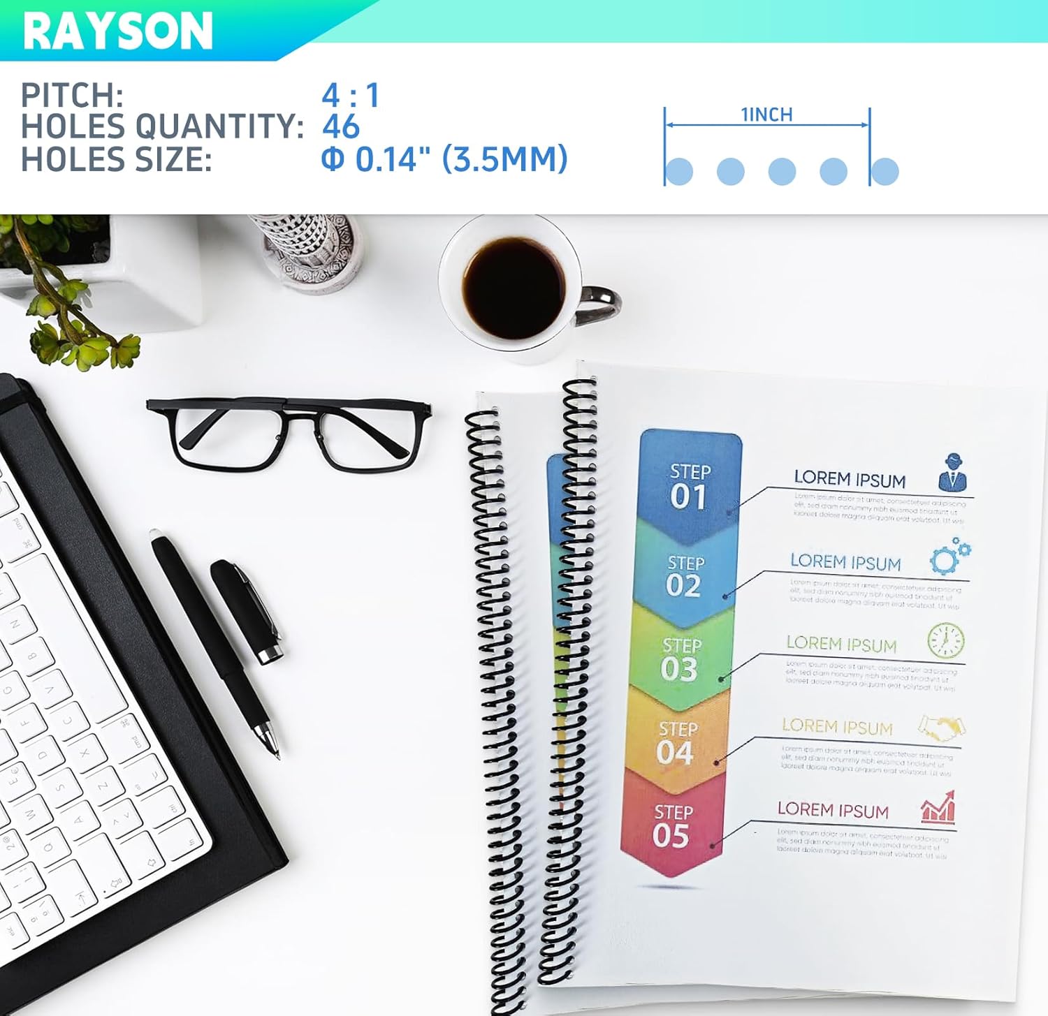 - Compatible with 4:1 pitch spiral binding coils and 46-hole for binding & punching letter size, A4 size or A5 size papers.