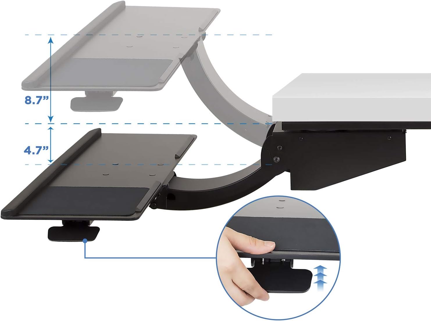 - HEIGHT ADJUSTABLE KEYBOARD PLATFORM: With a total of 13.4 inches of height adjustment, this under desk keyboard tray will let you sit and stand at your desk and achieve better ergonomics. The keyboard tray can be lifted 8.7 inches over the desk for standing and 4.7 inches below the desk surface for sitting.