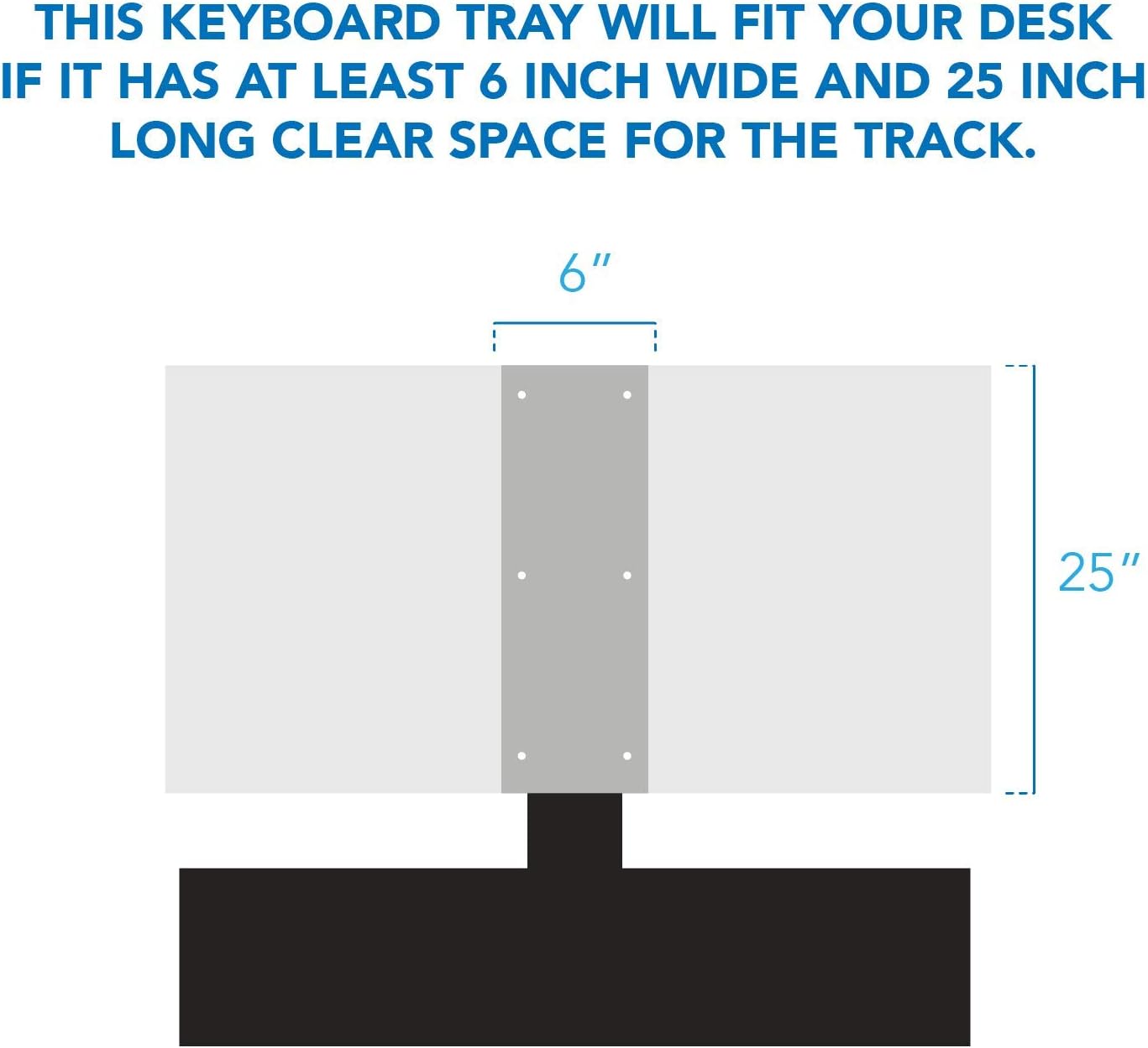- HEAVY DUTY AND EASY TO INSTALL: Enjoy this under desk keyboard drawer for years to come since it is made with heavy duty, quality materials. Assembles in minutes. PLEASE NOTE THE TRACK MEASURES 6 INCH WIDE AND 25 INCH LONG. PLEASE ENSURE ADEQUATE SPACE IS AVAILABLE UNDER DESK FOR THE TRACK. REQUIRES 0.9 INCH MIN DESK THICKNESS.