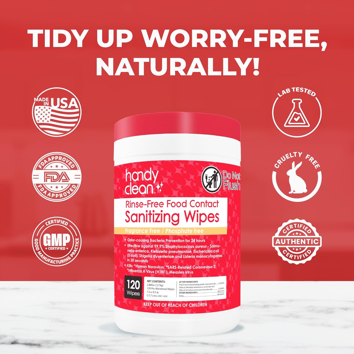 - Your New Go-to Surface Sanitizing Wipes - Clean naturally and worry-free! Made in the USA, lab-tested, cruelty-free, earth-friendly, fragrance-free, and phosphate-free with no harsh chemicals—spill and leak-free, easy-to-carry 9” x 8” wipes.