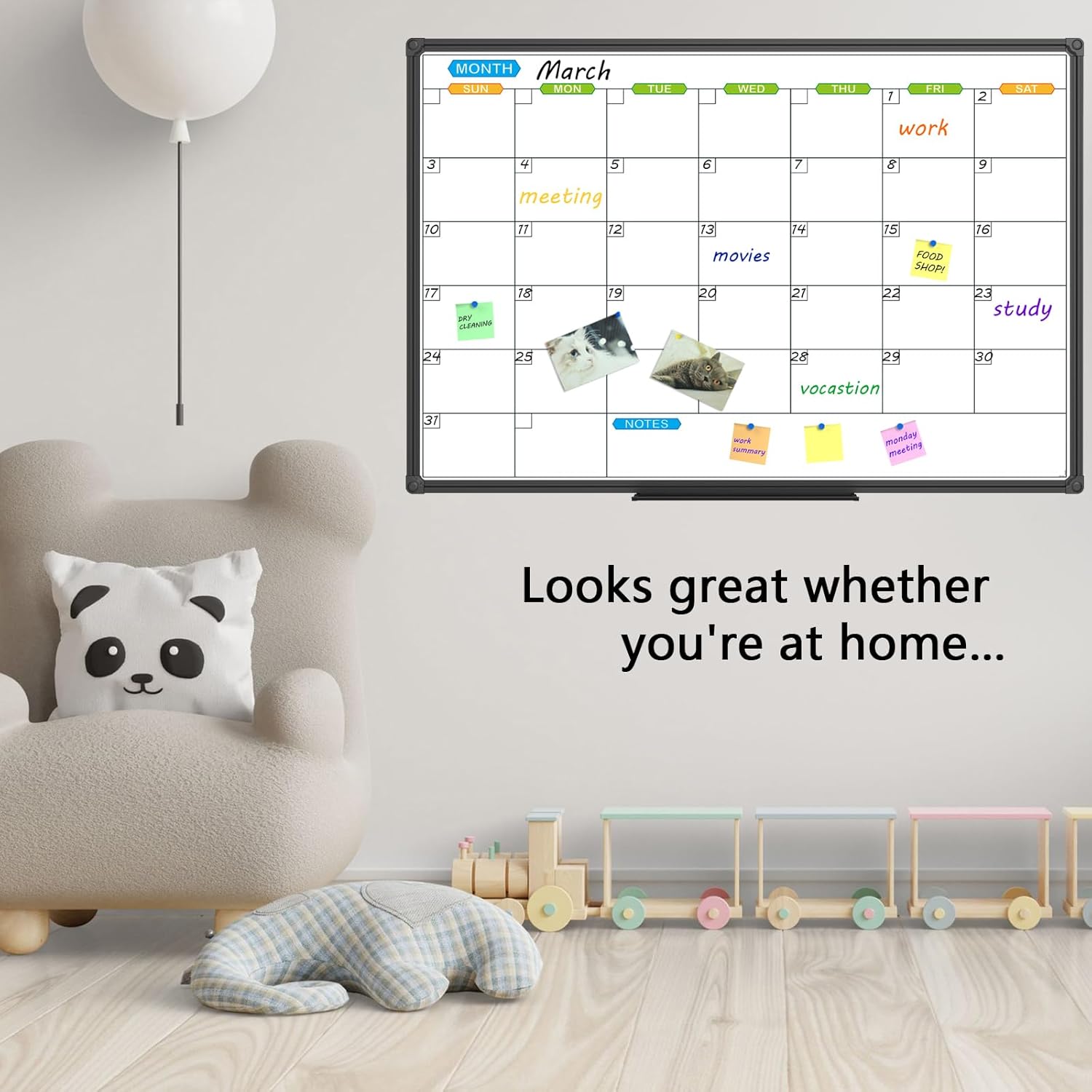 - MAGNETIC & CALENDAR WHITEBOARD SURFACE: Surface can be used to mark dates meetings and appointments, Organize weekly plan, never forget important calendar, Strong magnetic performance, easy to put notes, pages, documents, photos, graphs and cards on. Creating more working, learning and playing experience.