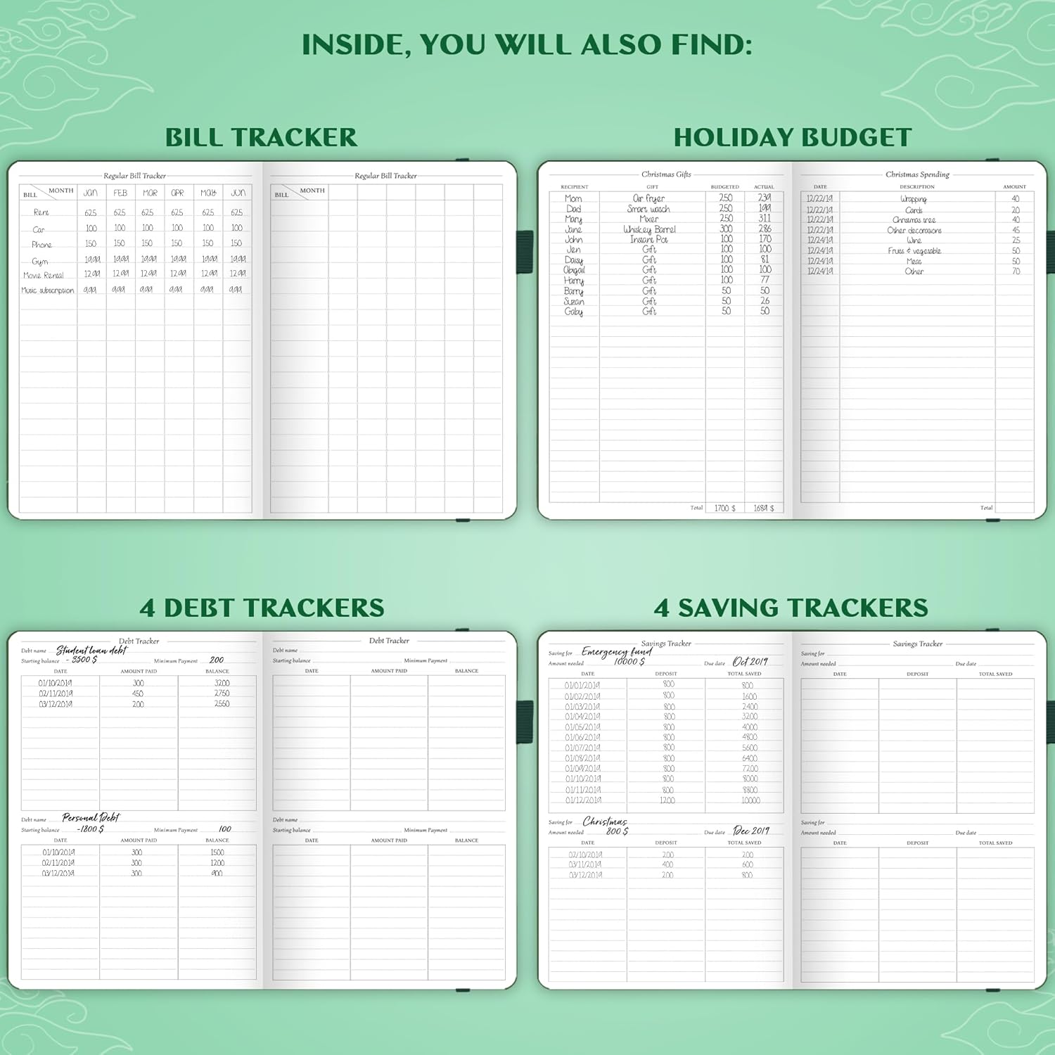- MASTER EFFICIENT BUDGETING, SAVING & DEBT MANAGEMENT – At the back of the budget book, you will find 8 savings and 12 debt trackers, a holiday budget, and a regular bill tracker.