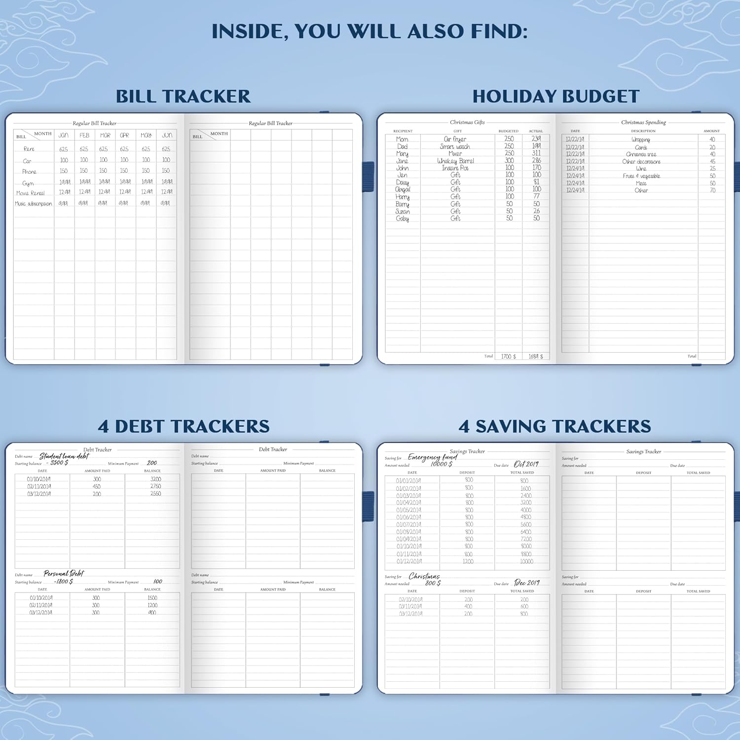 - MASTER EFFICIENT BUDGETING, SAVING & DEBT MANAGEMENT – At the back of the budget book, you will find 8 savings and 12 debt trackers, a holiday budget, and a regular bill tracker.