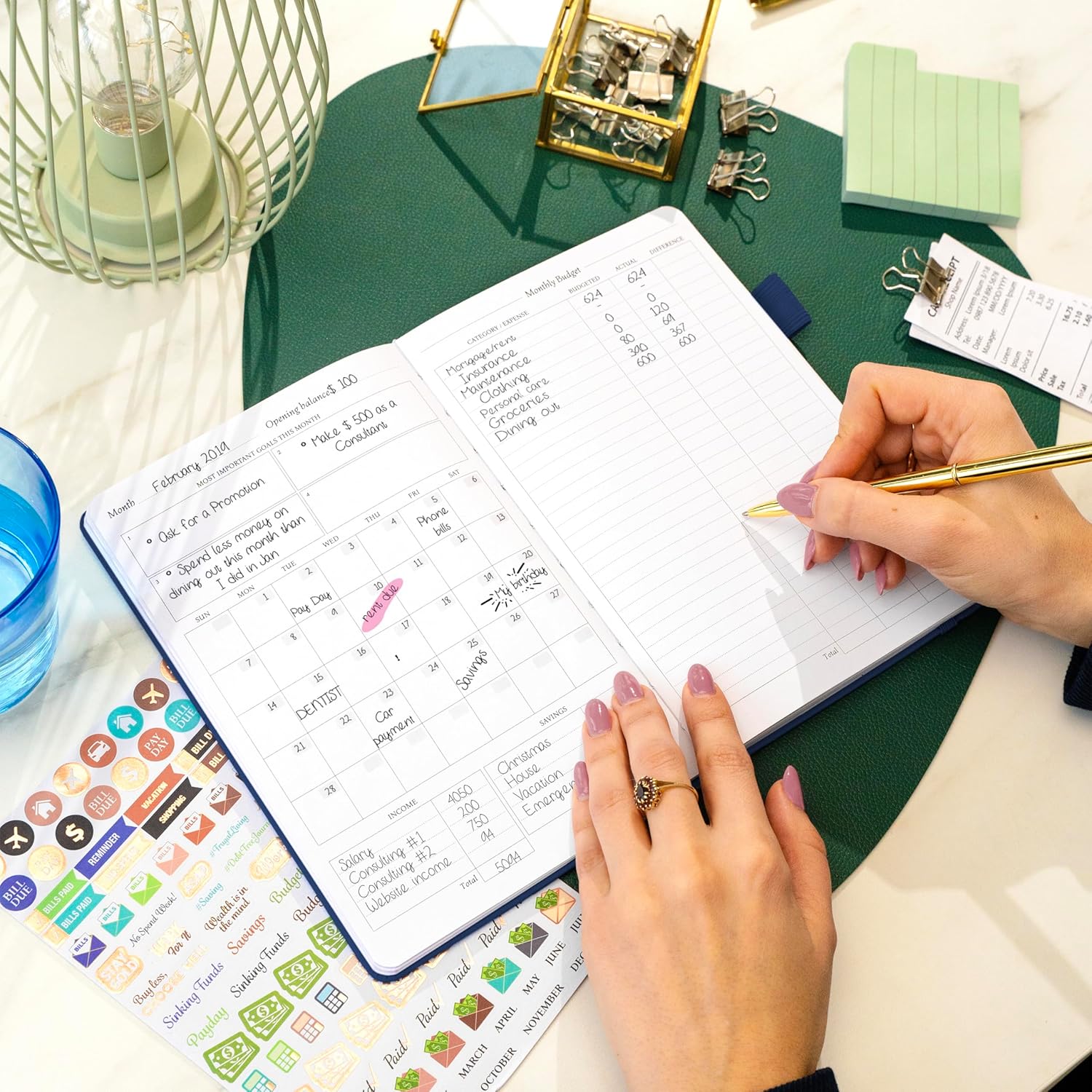 - TAKE CONTROL OF YOUR MONEY, BILLS & RECEIPTS – Each monthly section contains a calendar, a monthly budget page, an expense tracker, and a budget review to monitor all aspects of your finances.
