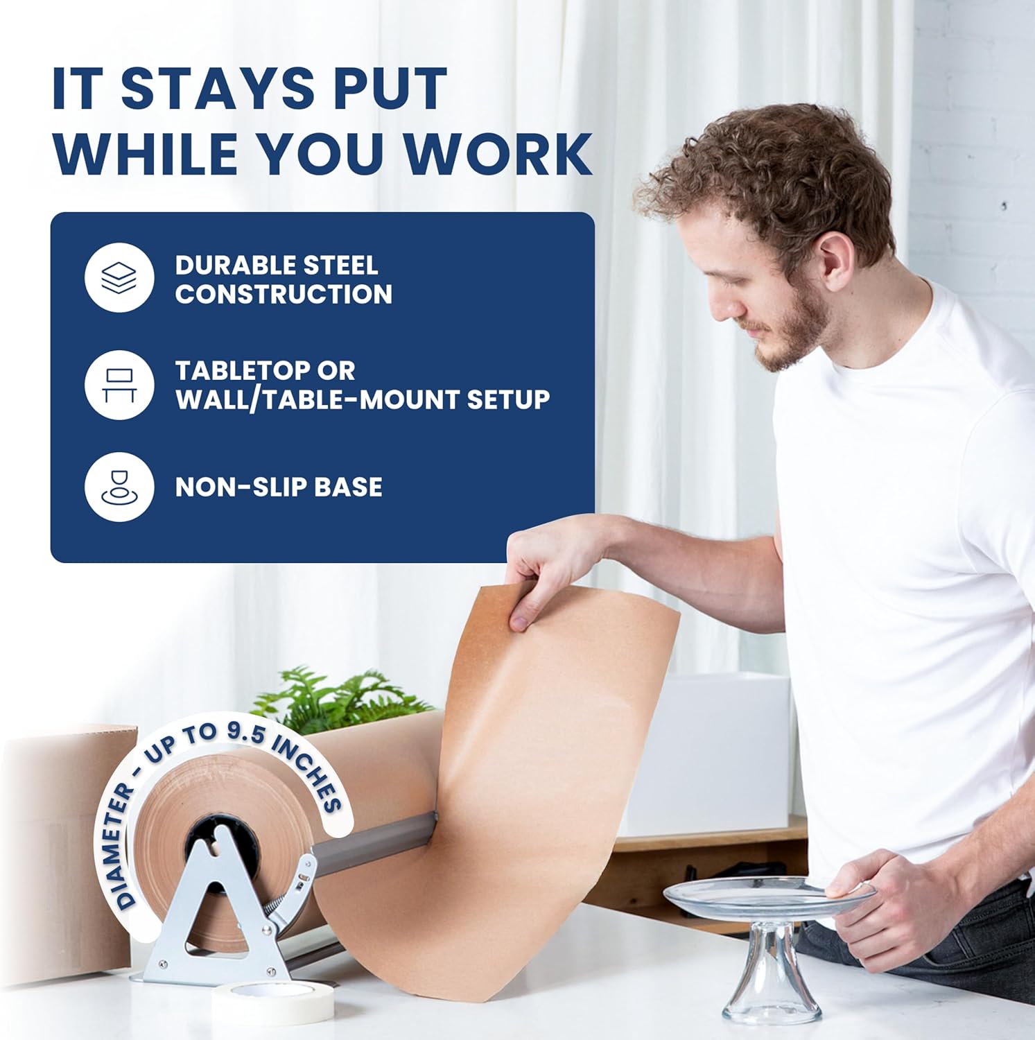 - Roll Compatibility: Fits rolls up to 18'' wide, max 9'' diameter (equivalent to 1000ft on a 1'' core). Be sure to insert your paper with the loose end over the top; butcher paper, construction paper, brown paper, or craft paper may be used