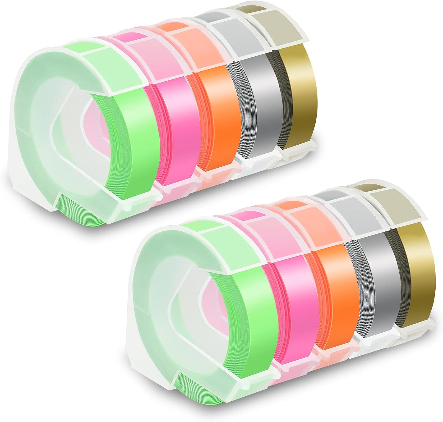 - Color: Self-Adhesive Vinyl White Print on Neon Pink/Neon Orange/Neon Green/Gold/Silver Tapes, 2 Rolls each Color. Size: 3/8 inch (9mm) x 9.8 feet (3m)