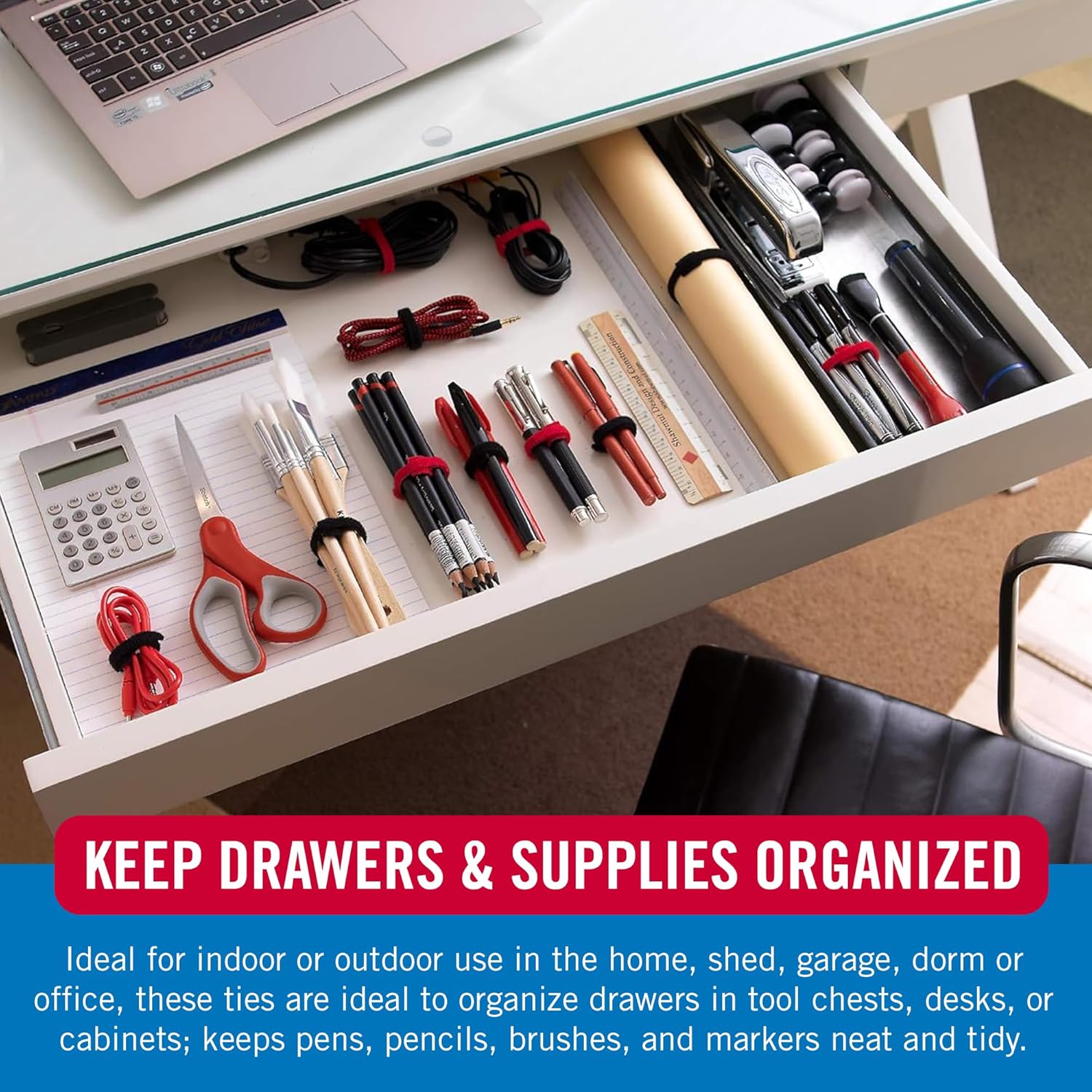 - KEEP DRAWERS AND SUPPLIES ORGANISED - Ideal for indoor or outdoor use in the home, shed, garage, dorm or office, these ties are ideal to organise drawers in tool chests, desks, or cabinets; keeps pens, pencils, brushes, and markers neat and tidy