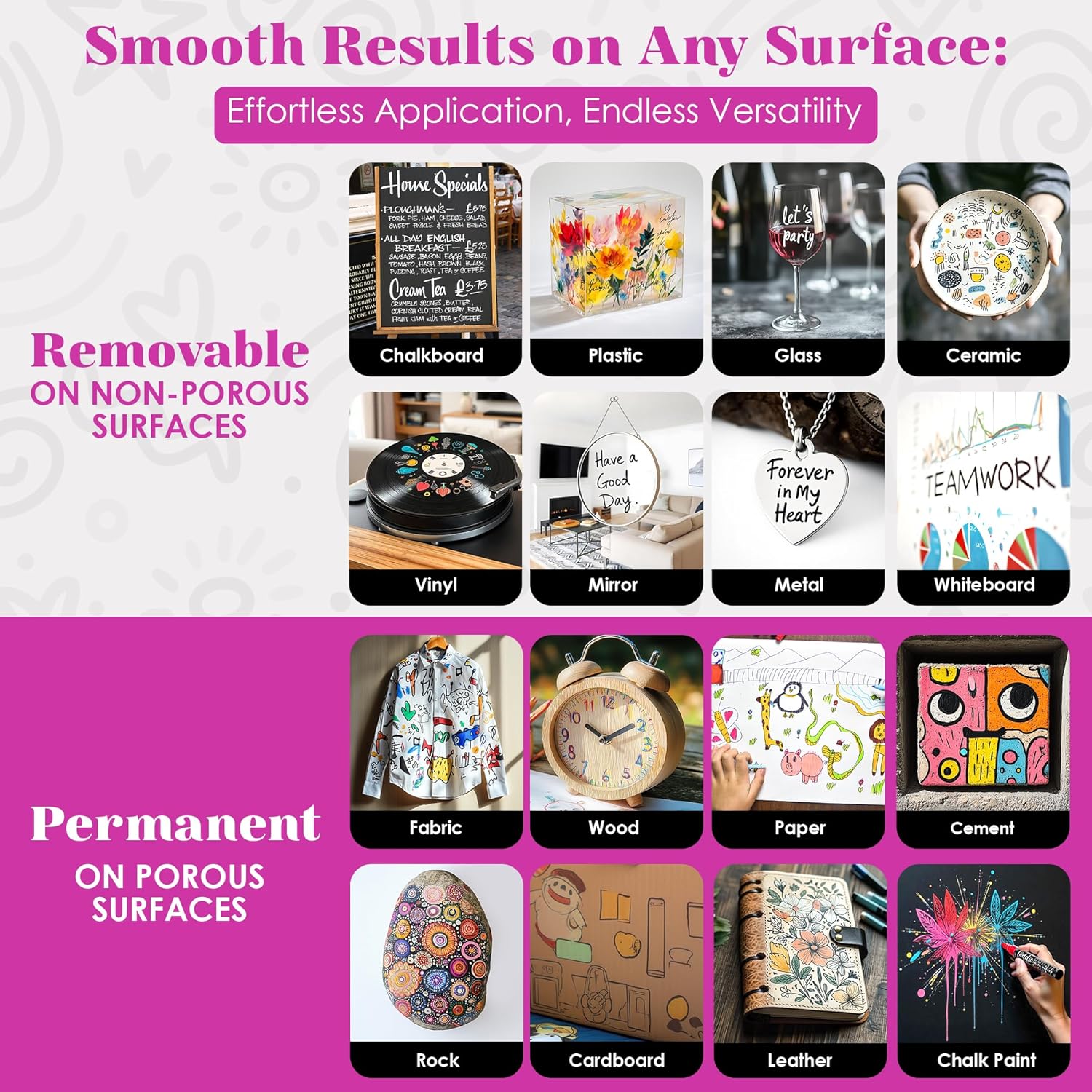 - Quick Cleanup: Wipe away your art made by this liquid chalk marker pack with a damp cloth on non-porous surfaces. Our liquid chalk markers for chalkboard erase without ghosting on glass and metal but may stain porous surfaces. Ideal for holiday decorating, these liquid chalkboard markers erasable are perfect for non-porous surfaces