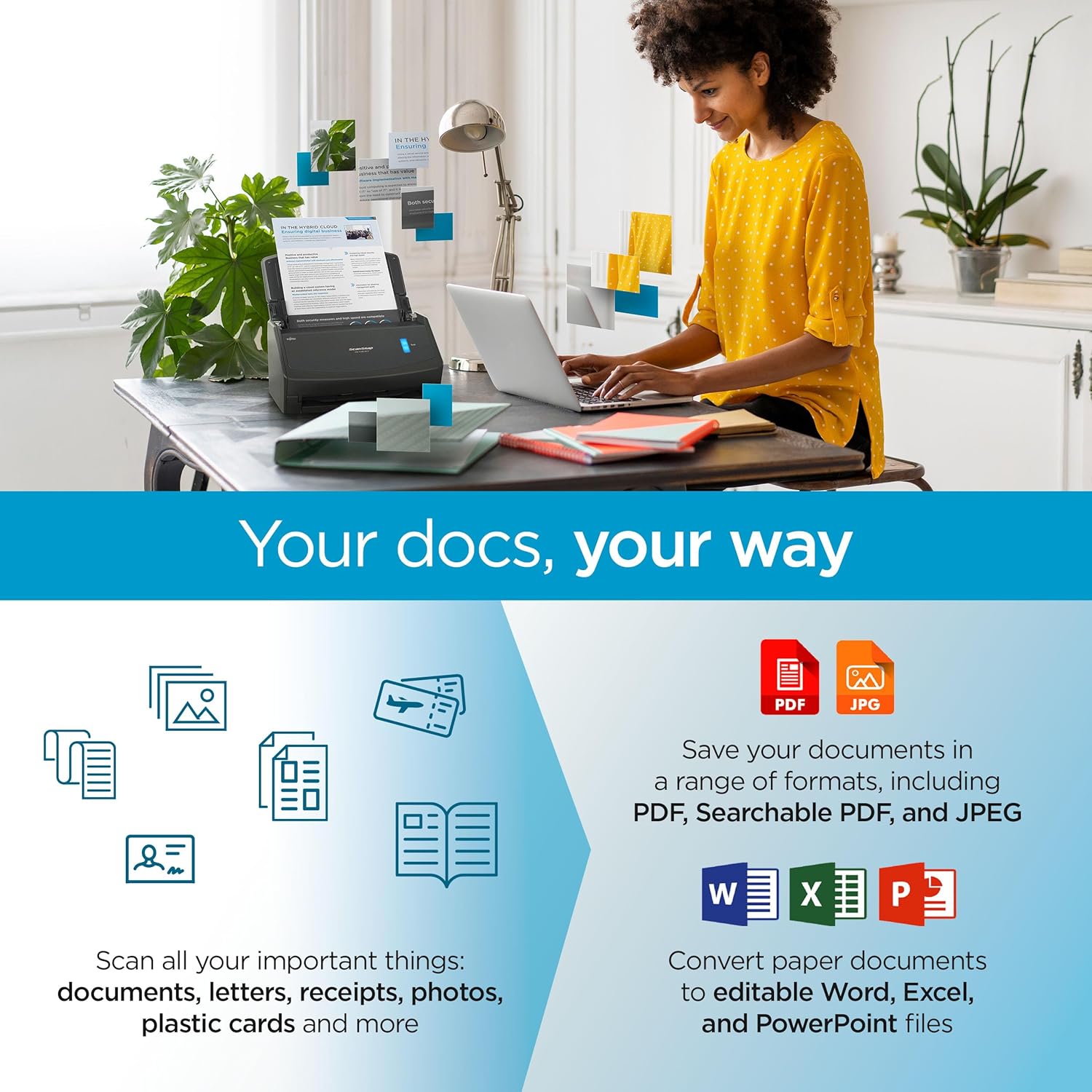 - PHOTO AND DOCUMENT ORGANIZATION MADE EFFORTLESS. ScanSnap Home all-in-one software brings together all your favorite functions. Easily manage, edit, and use scanned data from documents, receipts, business cards, photos, and more