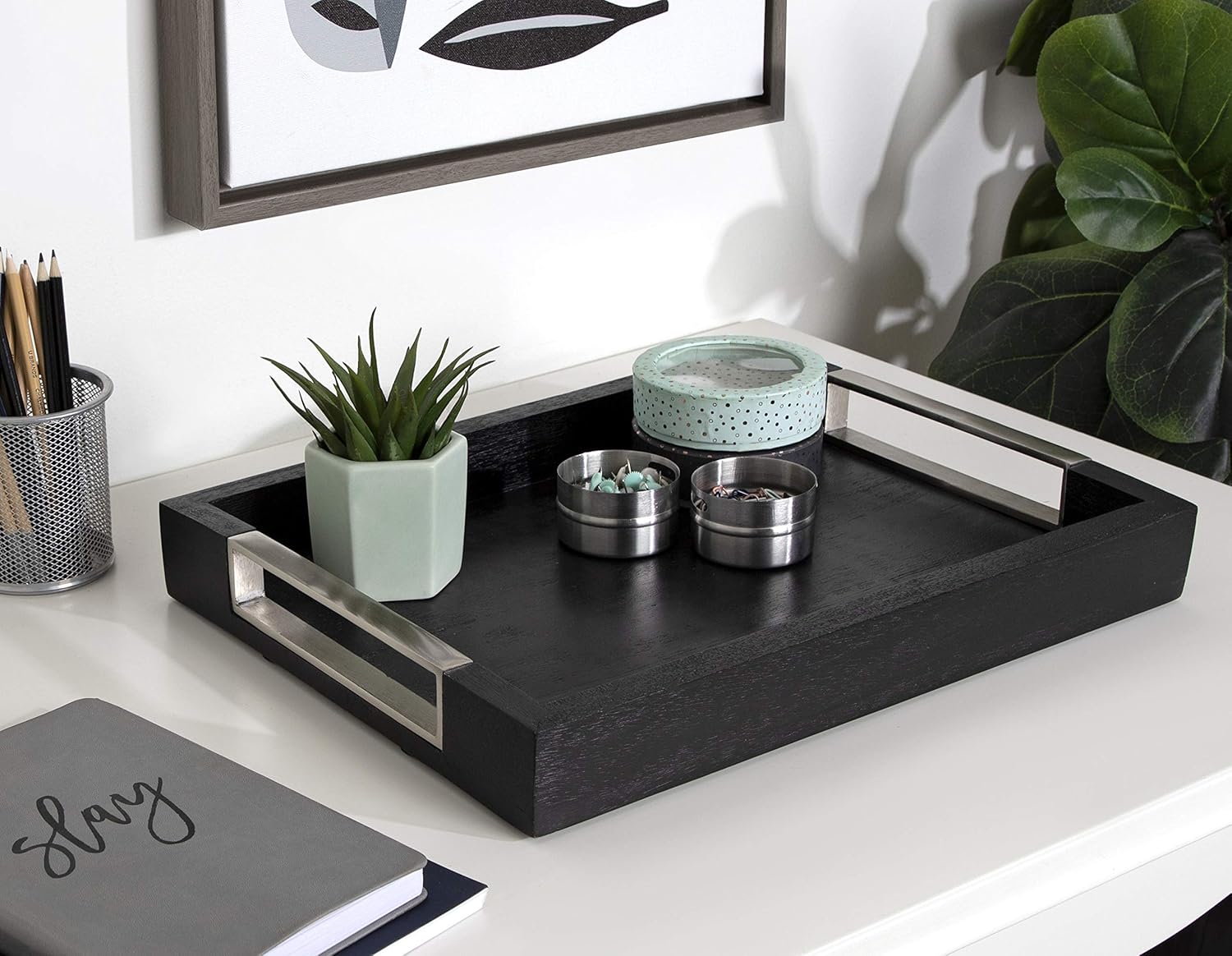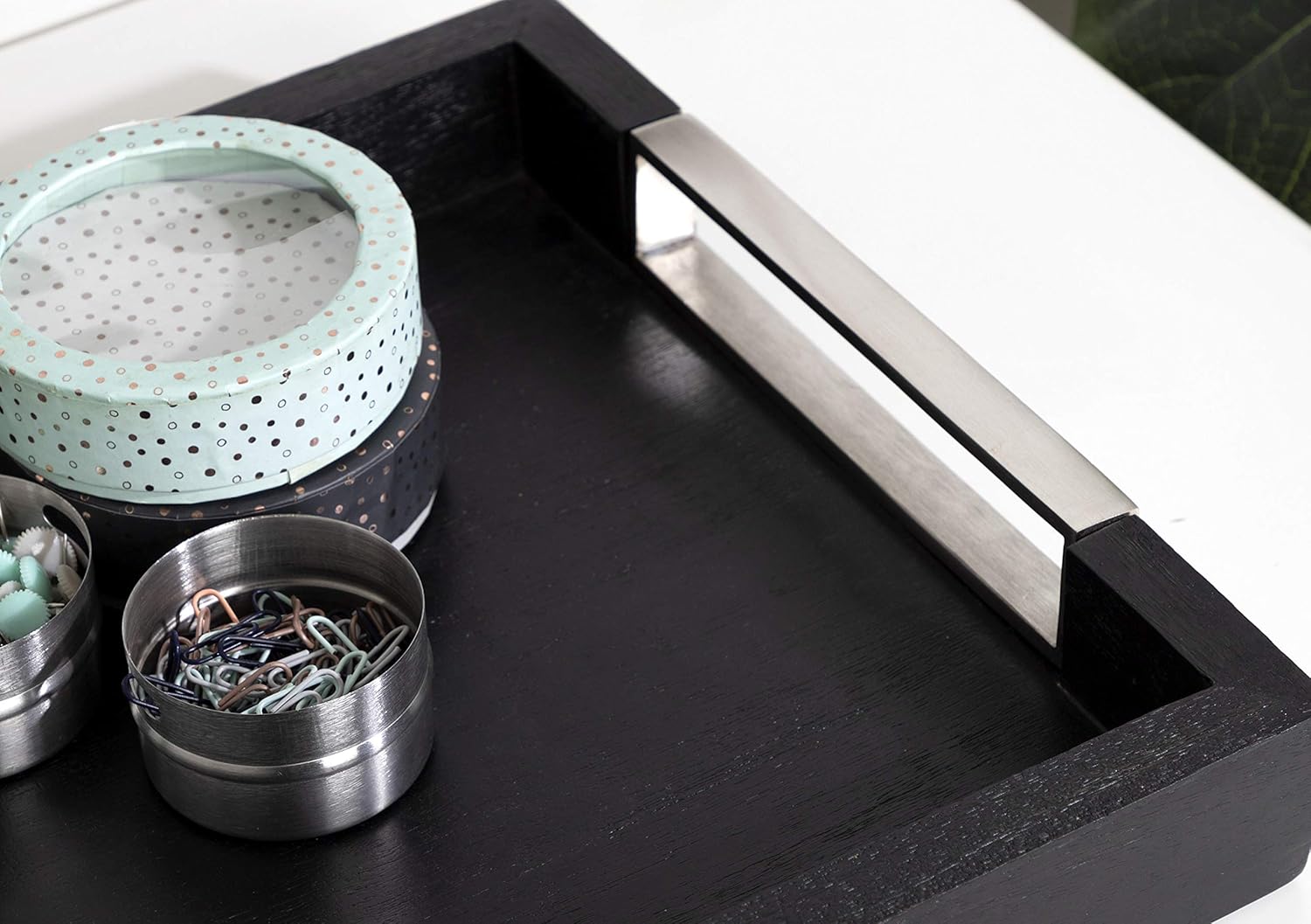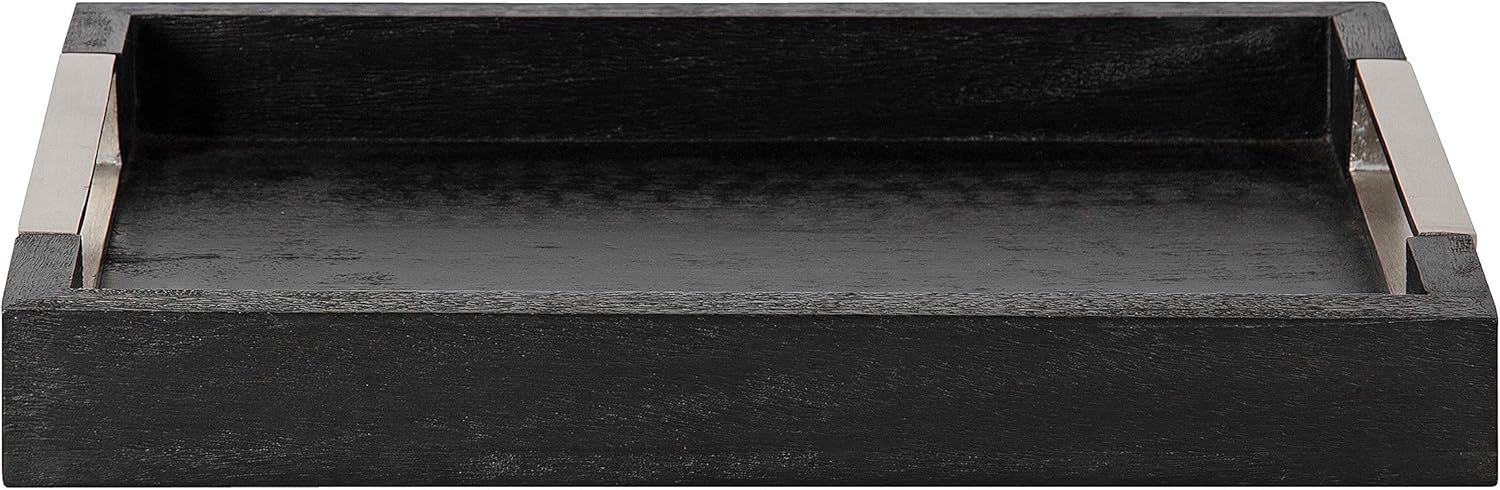 - SLEEK LOOK: This bold tray features a classic rectangular design with a sleek black finish and two handles with a nickel-plated finish