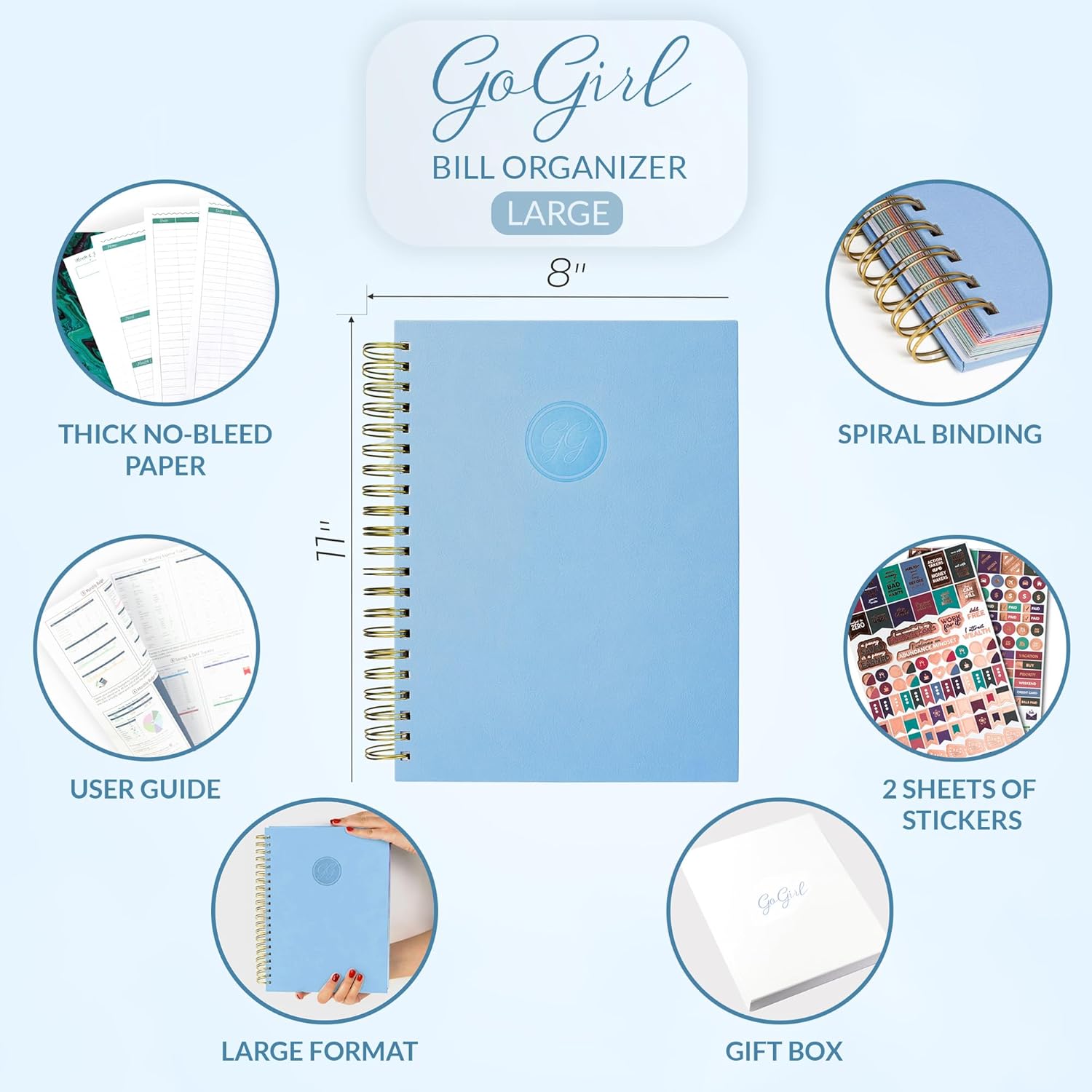 - UNDATED, MEDIUM SIZE & STICKERS: GoGirl financial planner comes in medium format (8x11 inches) and has undated pages, eco-leather hardcover, thick 120gsm paper, double-wire binding, stickers, and a user guide included.
