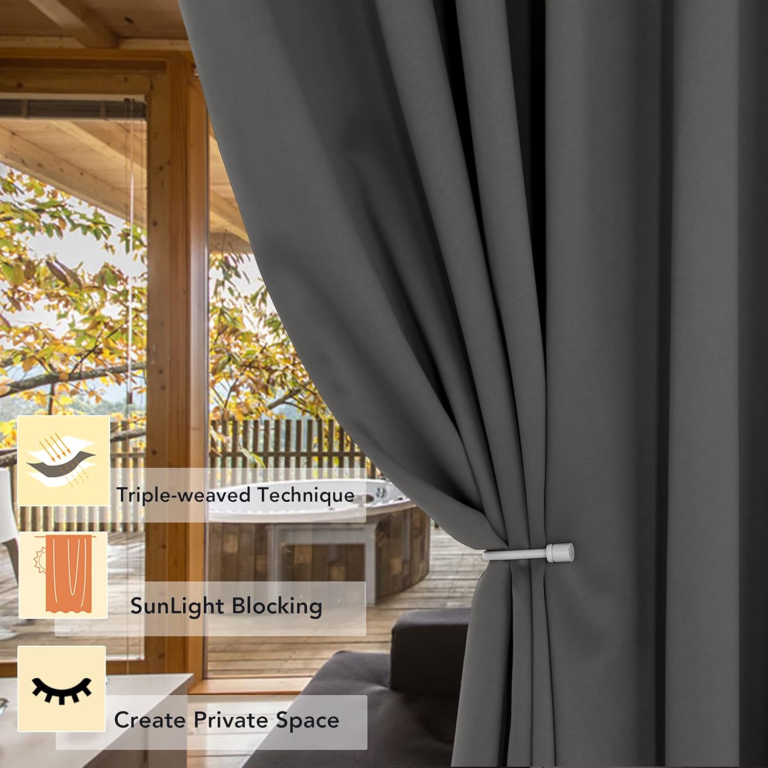 - PREMIUM BLACKOUT MATERIAL: Our room darkening curtain is made of 100% polyester fabric and have the same color with the front and back. Crafted in a certified STANDARD 100 by OEKO‑TEX factory from a durable soft and thick triple weave blackout fabric which block out 90% above sunlight and UV rays. Darker colors work better.