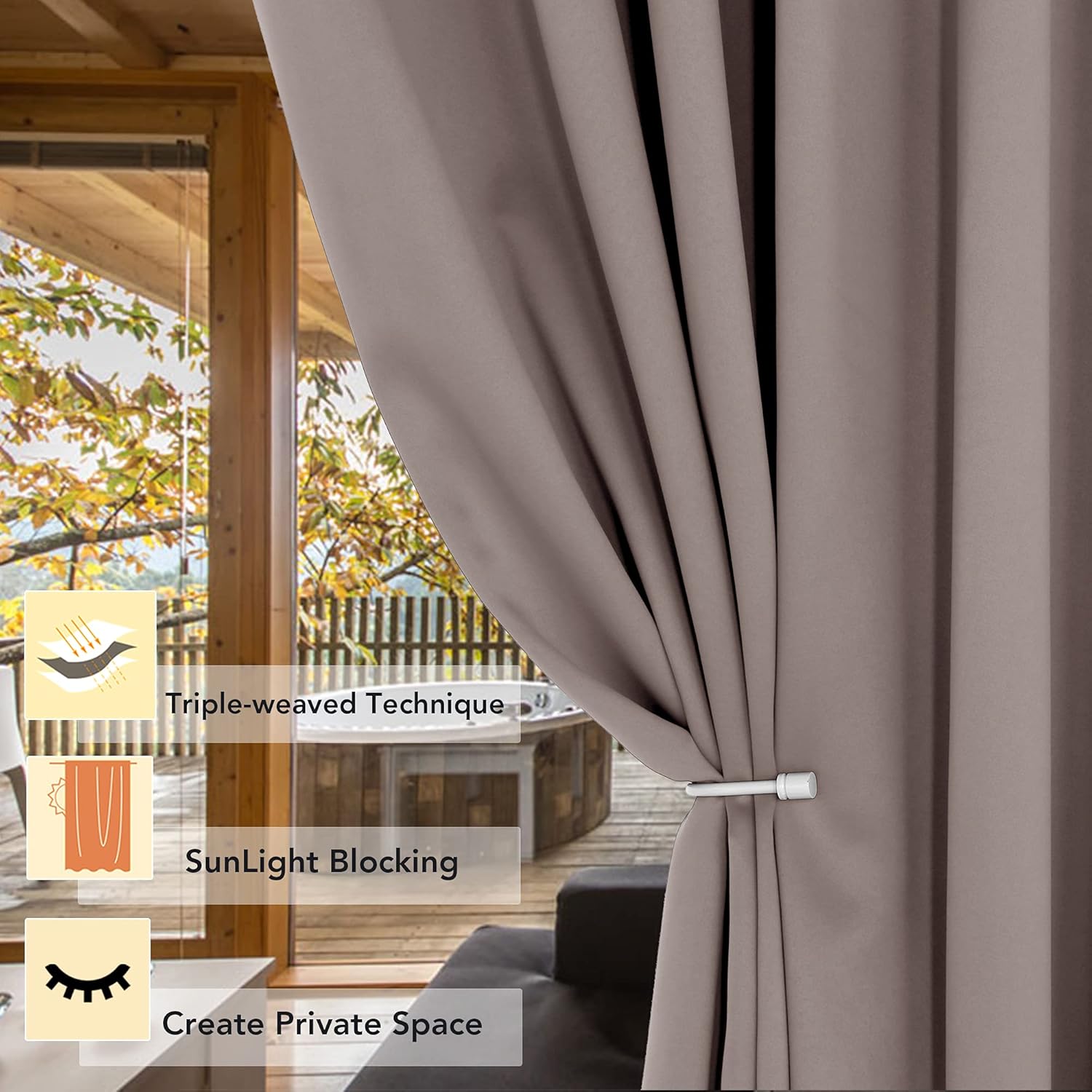 - PREMIUM BLACKOUT MATERIAL: Our room darkening curtain is made of 100% polyester fabric and have the same color with the front and back. Crafted in a certified STANDARD 100 by OEKO‑TEX factory from a durable soft and thick triple weave blackout fabric which block out 90% above sunlight and UV rays. Darker colors work better.