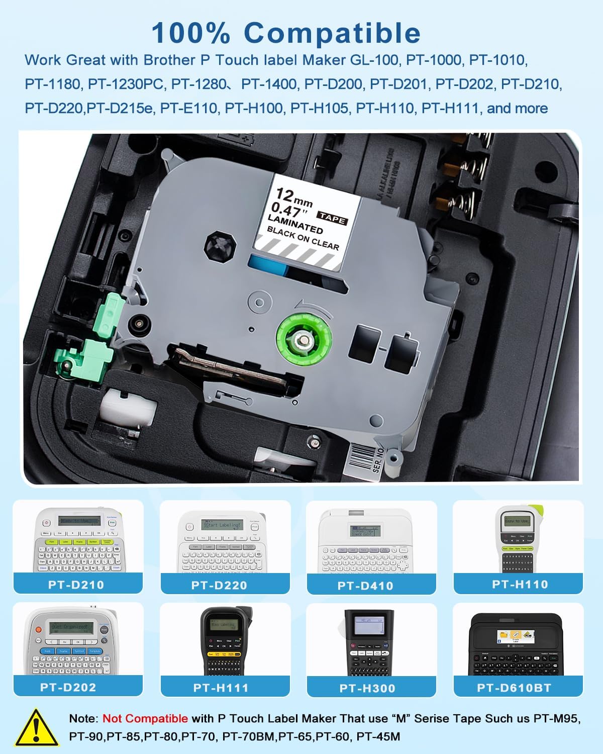 - Label Maker Tape Compatible with brother 12mm .47 laminated clear tz tape water resistant, abrasion resistant, temperature resistant, fade resistant; Replace for Brother clear label tape can be use for outdoors, and they work equally well indoors