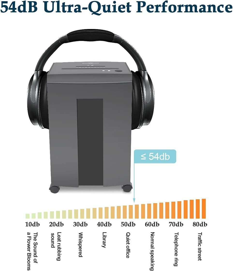 - LOW NOISE LEVEL 54dB ultra quiet heavy duty shredder has 6 gallons pull-out waste bin with large transparent window