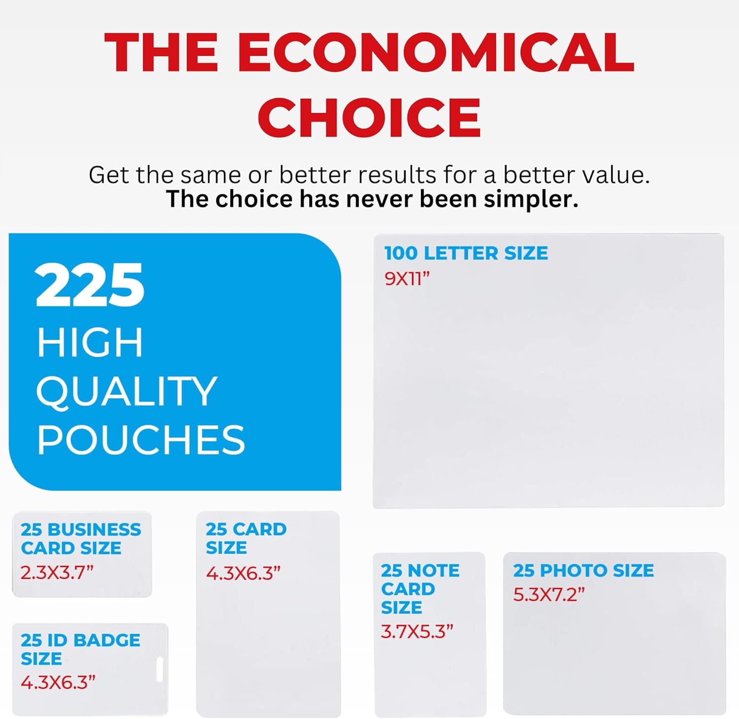 - ✅ MULTI-SIZED LAMINATION POUCHES FOR CARD, BADGES, LETTERS: Our handy bundle pack comes complete with 25 business card sizes at 2.3in. x 3.7in.; 25 ID badge sizes at 2.5in. x 4.2; 25 card sizes at 4.3in. x 6.3in.; 25 notecard sizes at 3.7in. x 5.3in.; 100 letter sizes at 9in. x 11.5in.; and 25 photo sizes at 5.3in. x 7.2in.