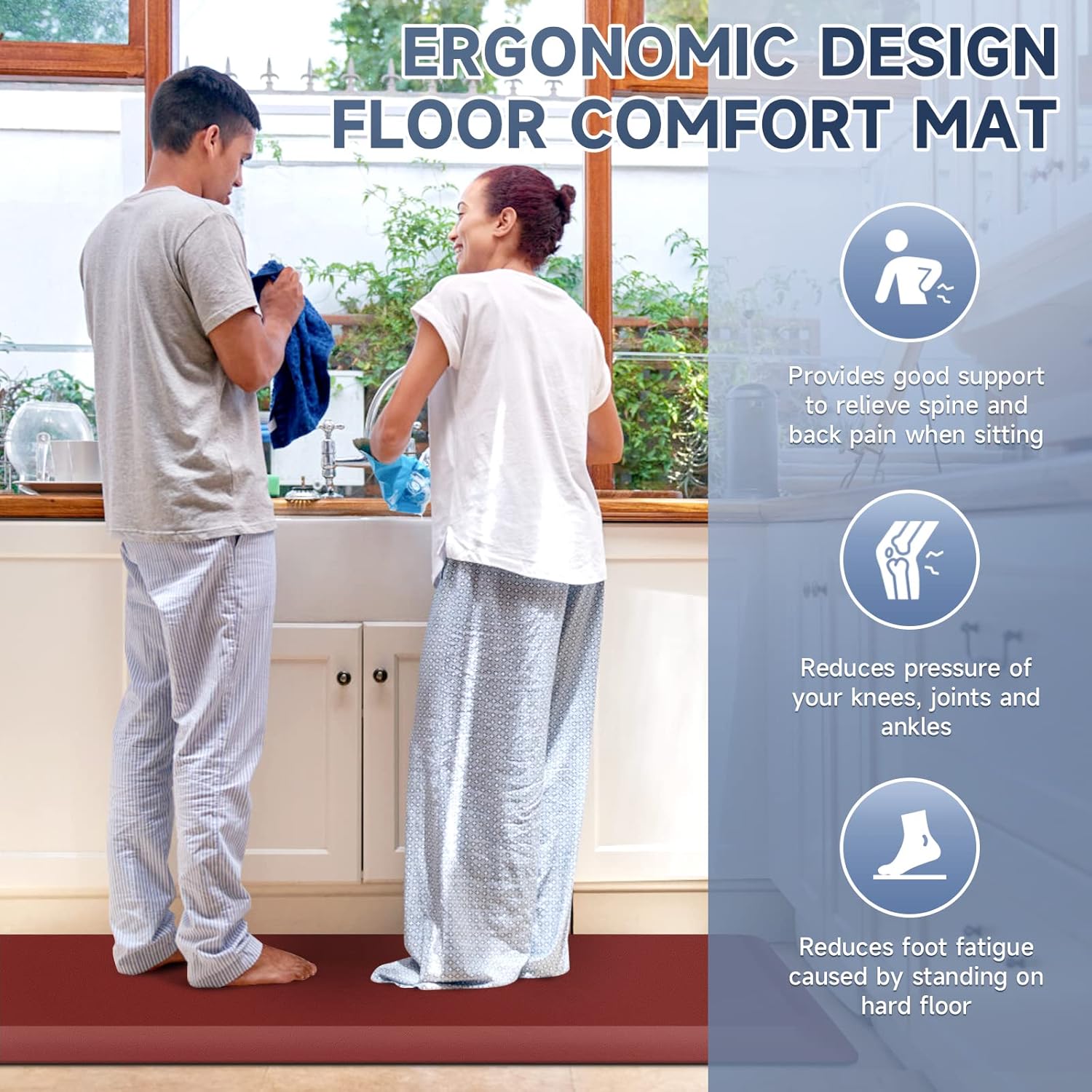 - 【Anti-Fatigue】Comfort floor mat provides comfort when standing. Reduces pressure on knees and ankles. Relieves back and spine pain when standing and relieves fatigue caused by standing for long periods.