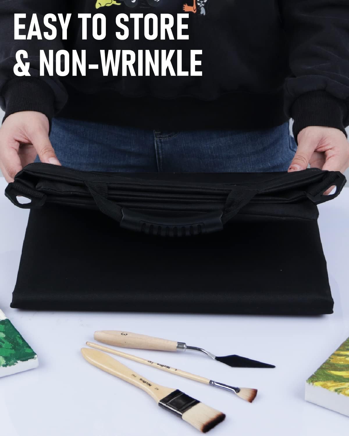 - Collapsible Design for Easy Storage. The collapsible nature of the portfolio bag allows for effortless storage when not in use, making it ideal for artists who require a portable solution for transporting their artwork. The ability to fold down the bag to a compact size saves space and facilitates convenient storage in studios, closets, or travel luggage