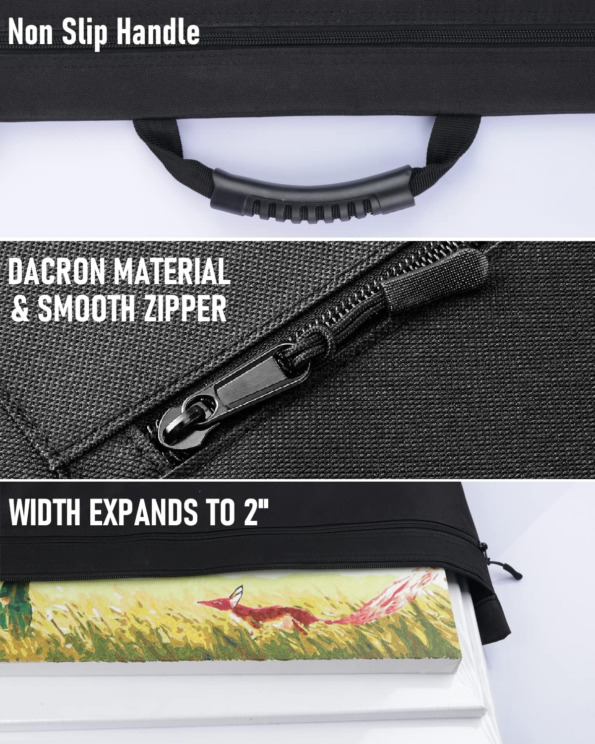- Multiple Pockets for Organization. The portfolio bag features multiple pockets to organize artwork, supplies, and accessories efficiently. This allows artists to separate different pieces or materials within the bag, preventing them from shifting or becoming damaged during transit. Tips: The biggest pocket is actually 32.67 ''x42.9'', fits for 32" x 42" canvas. No need to worry about too small for your canvas