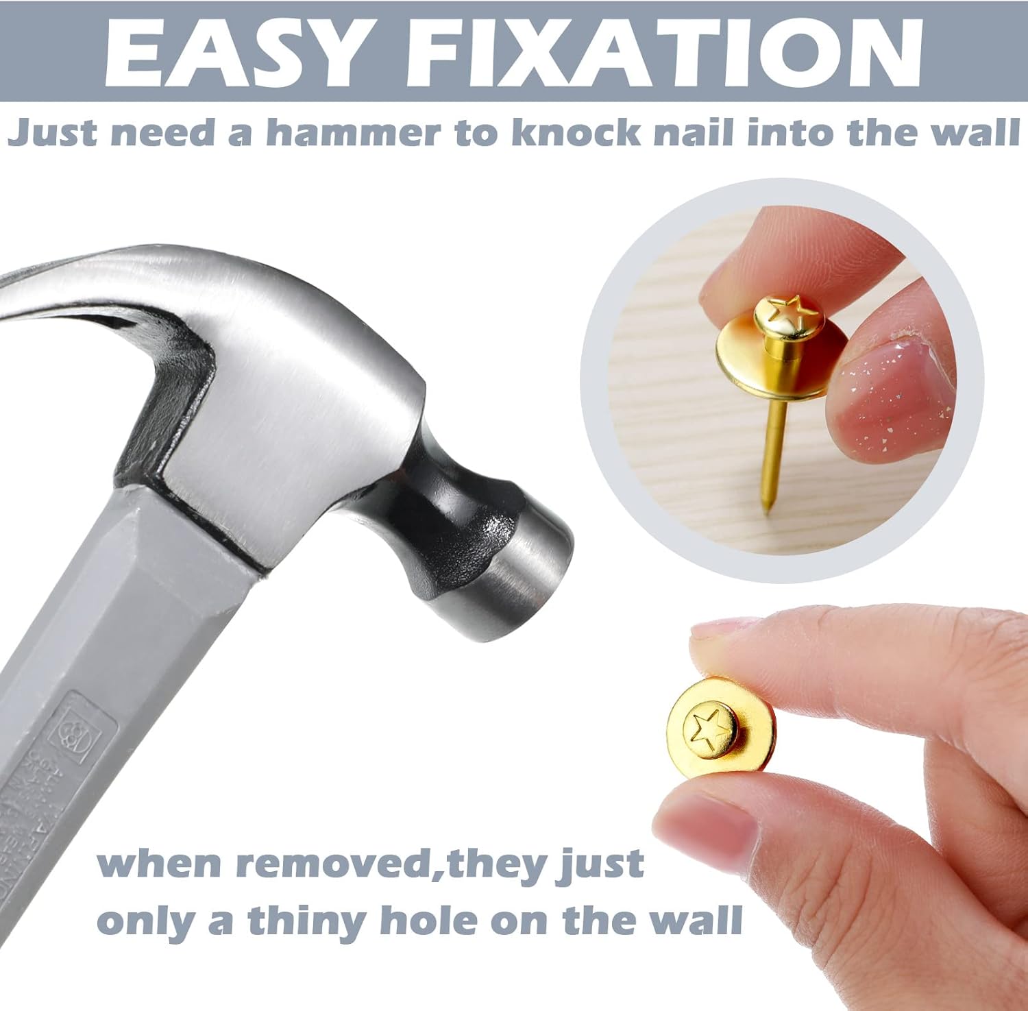 - Practical and Beautiful: picture hanger tacks are designed to be tacked into the wall, which will not affect the beauty of the home or damage the wall, just leaving a small hole in the wall; In addition, push pins for walls have proper crevice between 2 peg heads, which are suitable for you to hang a small pocket, key ring and more