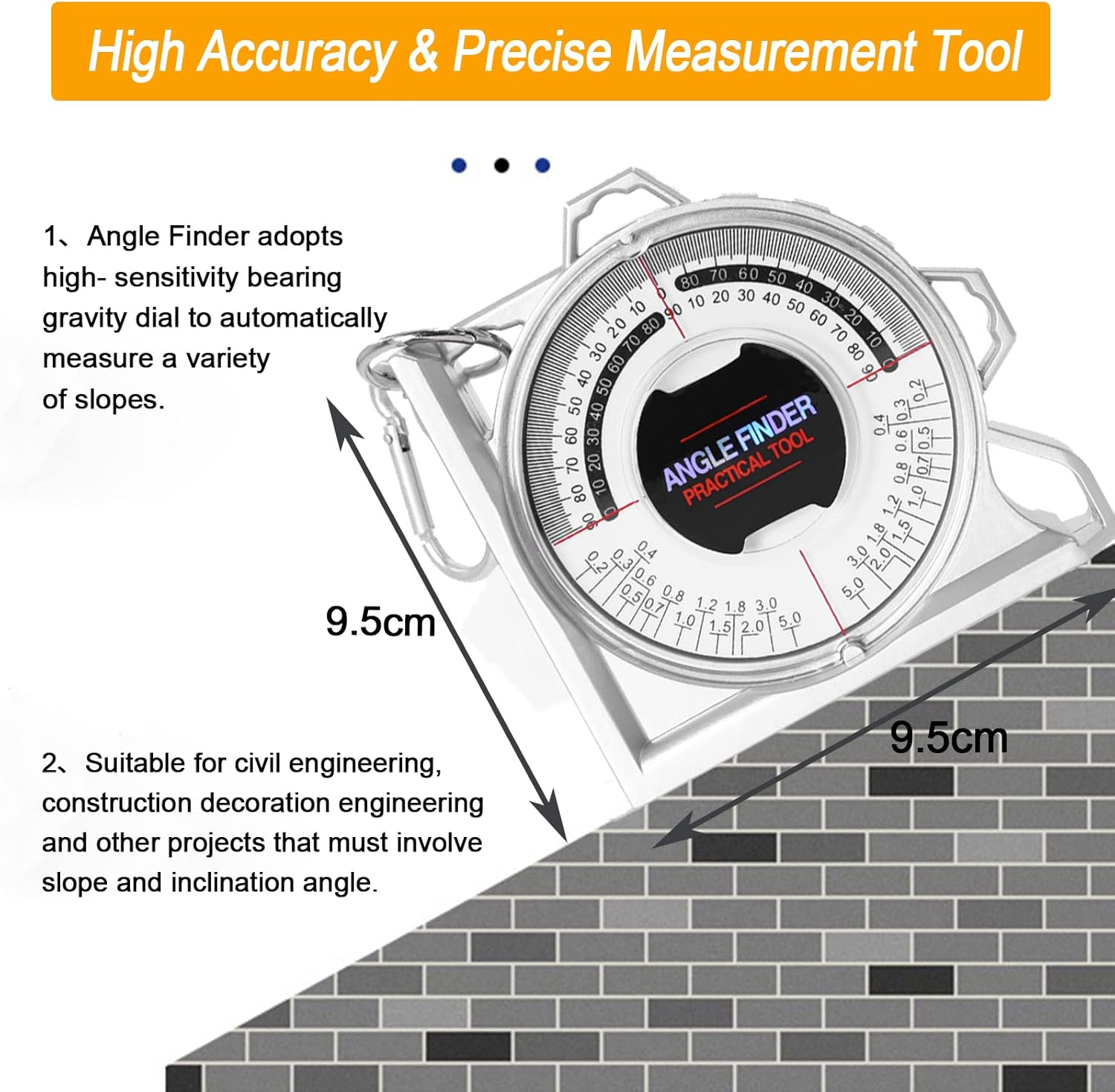 - Small Portable & Widely Used: This slope angle measurement tools are small in size, easy to carry and store, with double-hole hanging hole and strong buckle, easy to hang on the tool kit, more convenient to operate. Suitable for civil engineering, construction decoration engineering and other projects that must involve slope and inclination angle. This inclinometer is ideal gift for professionals craftsmen or handymen.