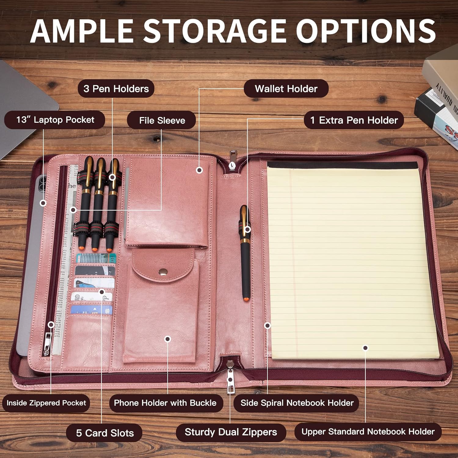 Personalized Vegan Leather Portfolio with Front Pocket for Women, Custom Zippered Padfolio Binder for 8.5 x 11 Legal Pad Notebook, Professional Laptop Case, Pink