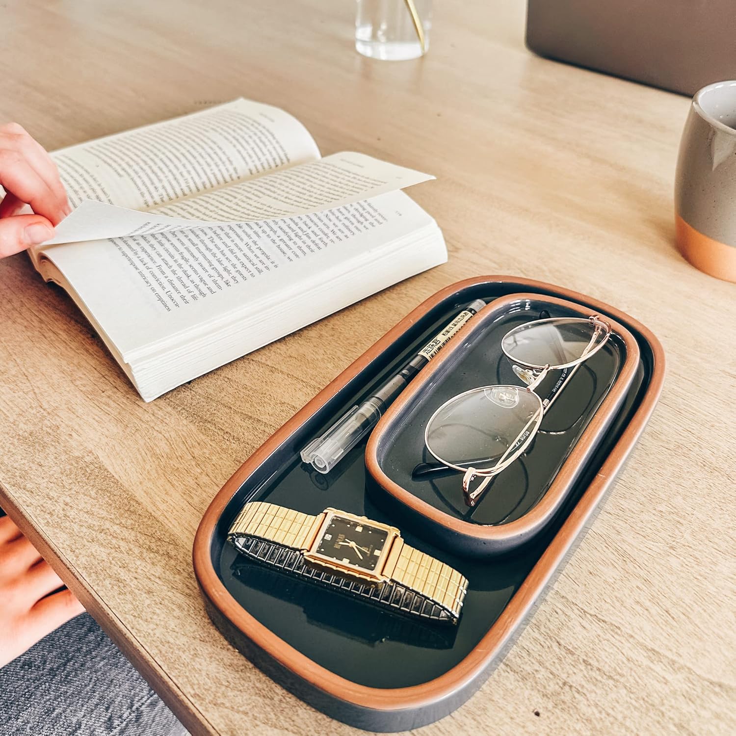 - IT’S TIME TO HIT PAUSE AND ORGANIZE: This is more than a tray. Mora is Latin for "Pause", acting as a reminder to slow down in your amazing life. An organized home is a calming home. Your Mora trays can help you do that. Whether you are taking off your jewelry at the end of the day, putting down your pen, or spraying your amazing perfume, your things deserve a beautiful storage space. Your organized tray is a reminder to hit pause, give yourself some me time, and practice mindfulness.