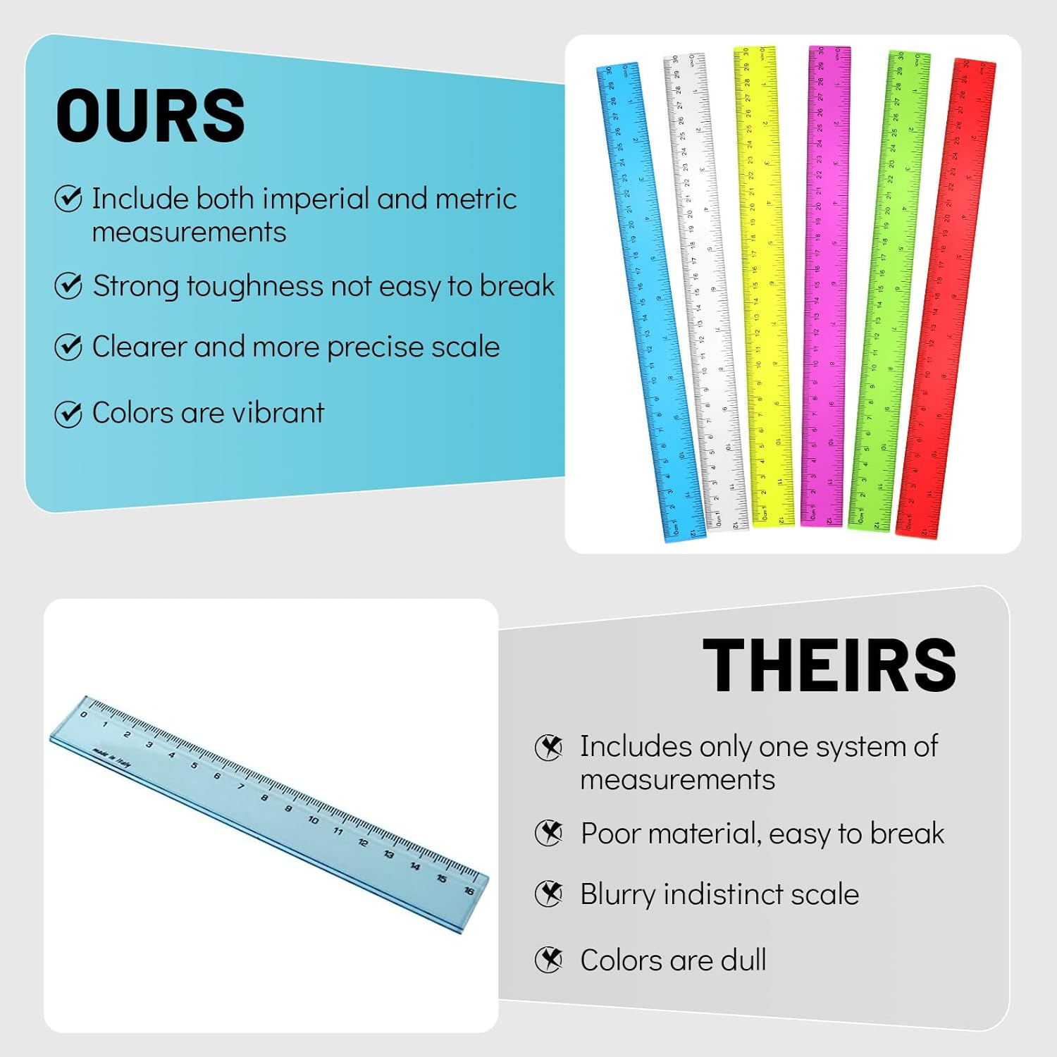 - 【6 Assorted Color Plastic Rulers】The Clear ruler's size is 12 inches/30 centimeters and is made of transparent plastic. Six colors - pink, transparent, blue, red, green, and yellow - will meet the preferences of most people. Children and students will also be happy because they have so many cute acrylic rulers to choose from.