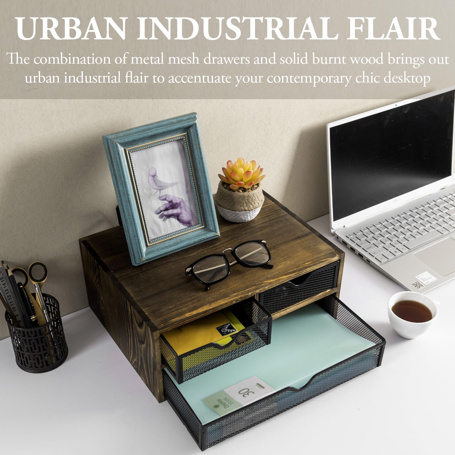MyGift Rustic Burnt Brown Solid Wood Desktop Organizer Box with 3 Removable Black Metal Mesh Trays, Office Desk Supplies Storage Drawers for Accessories
