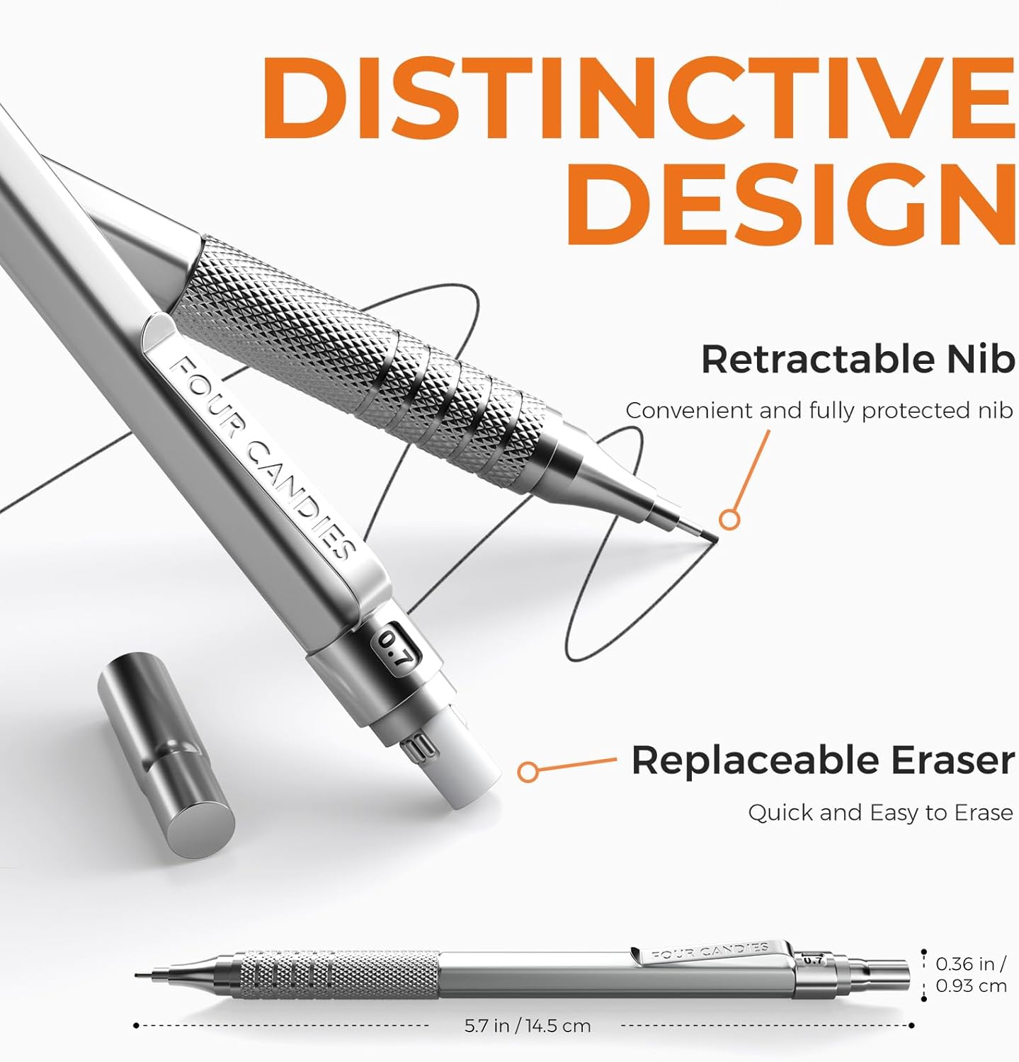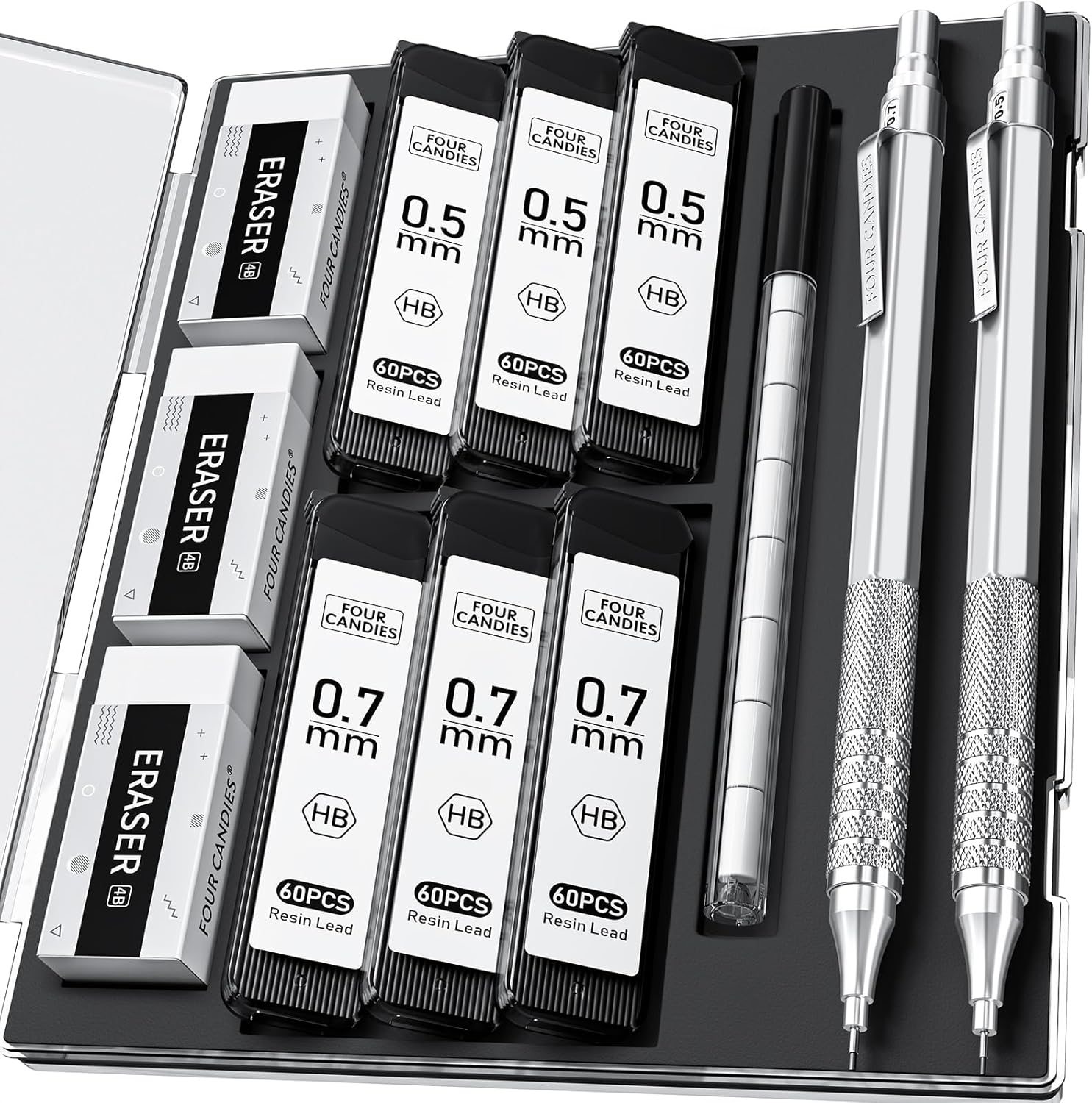 Four Candies 2PCS Metal Mechanical Pencils Set with Case, 0.5mm & 0.7 mm Artist Pencil with 6 Tubes (360PCS) HB Lead Refills, 3 Erasers,9 Eraser Refills For Writing Drafting, Drawing, Silver