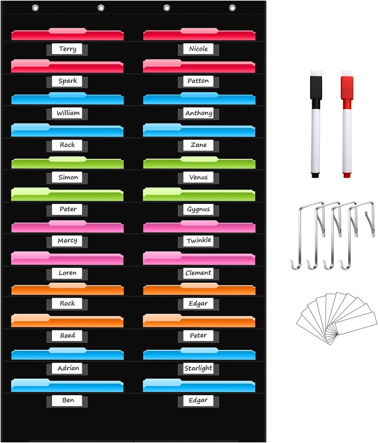 - ✿【You Will Get】Including 1piece of hanging file pocket chart with 24 pockets, 24 pcs of dry-erase white name labels, 4 pieces of door hooks and 2 pieces of black marker pens.