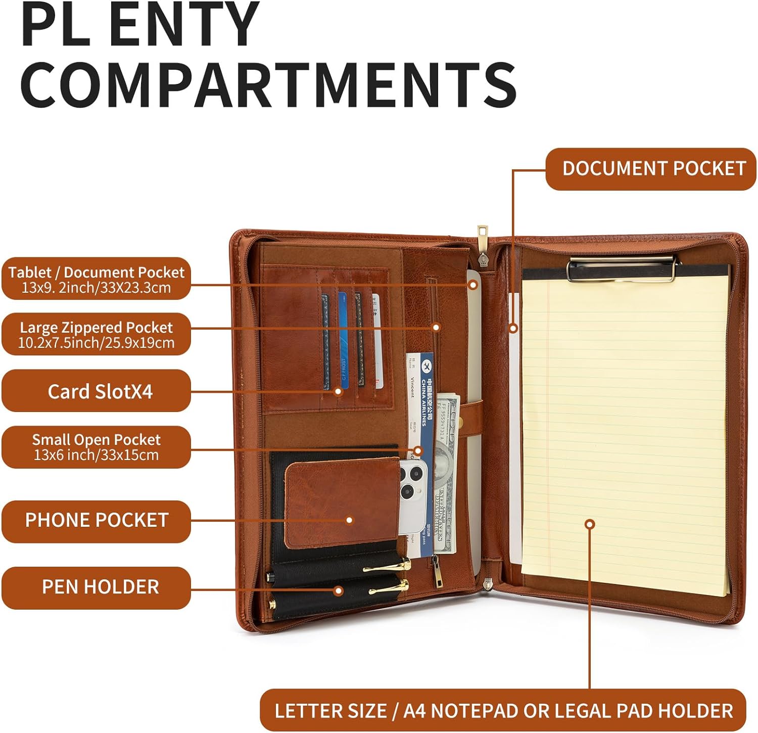 - MULTIFUNCTIONAL ORGANIZER FOR BUSINESS PEOPLE – With rationally designed multi-compartments and pockets in different sizes, our leather folder portfolio accommodates and organizes all your business essentials such as legal pads, loosen leaves, pens, cell phone, tablet, With the robust zipper closure, you can keep your stuffs safe and neatly organized inside the pad folio.Right side writing pad holder is designed for letter size (8.5” X 11.0”) replaceable notepad, spring clip.