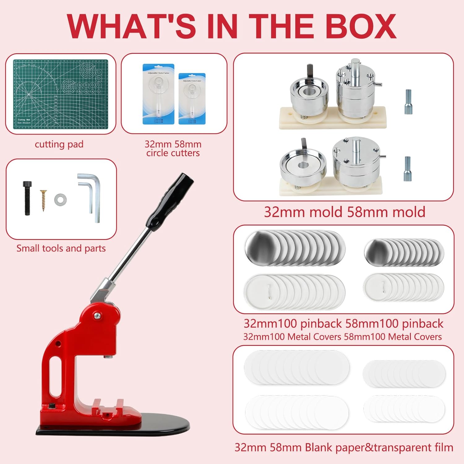 - 【MULTI SIZE CREATIVITY UNLIMITED】 Enjoy the fun of button making with one purchase! The metal button maker machine set is carefully built, including a sturdy and durable metal body, two kinds of button-model, 32mm and 58mm, 100 sets of 32mm button parts and 100 sets of 58mm button parts. Not only that, it also comes with two round cutters and a cutting board to provide you with full production support