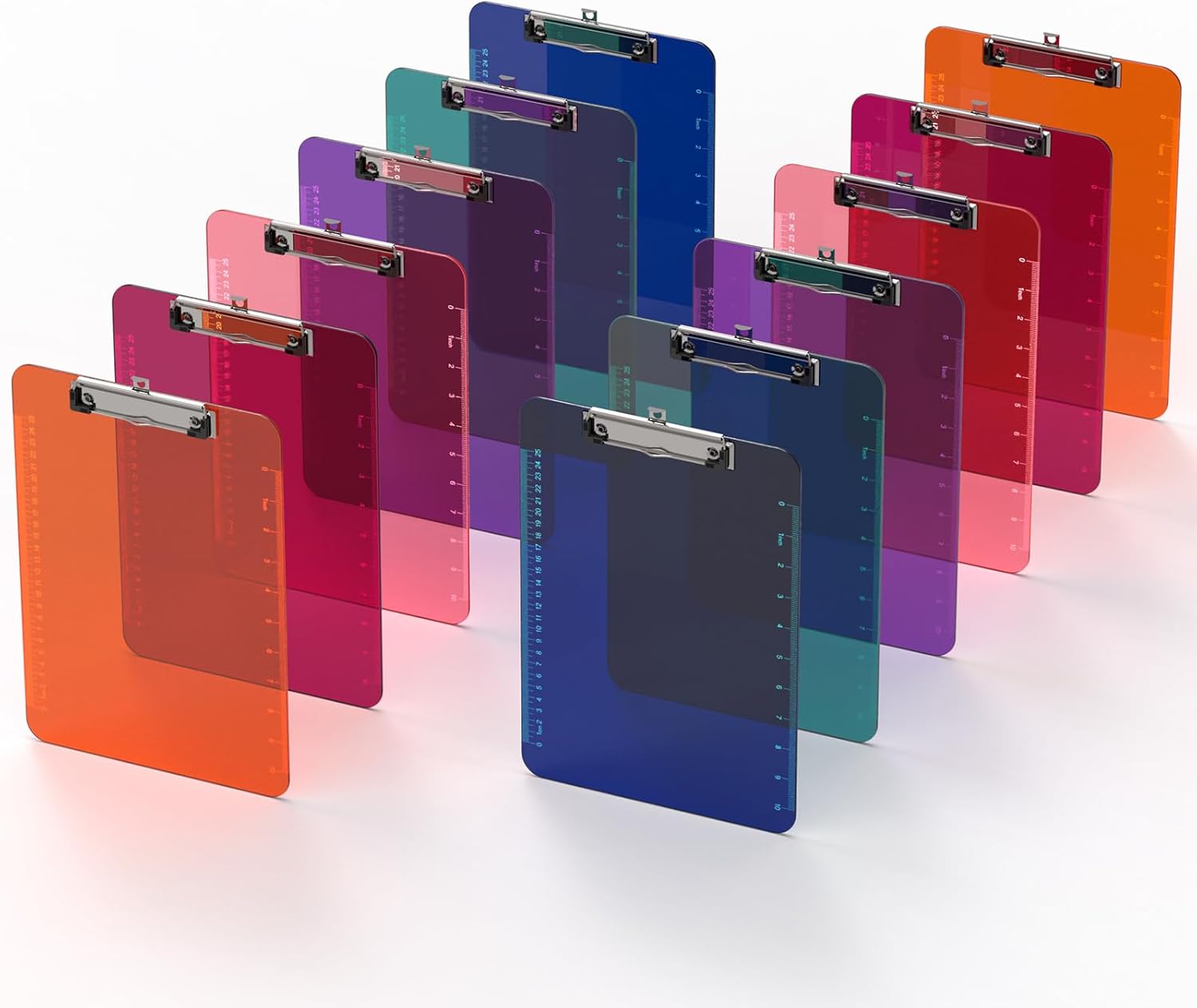 Bulk Clipboards Set of 12, 8.5x11 Plastic Colored Clear Clip Board with Ruler, Suitable for Classroom, Students, Kid, Size 9" x 12.5" with Low Profile Clip, Office & School Supply