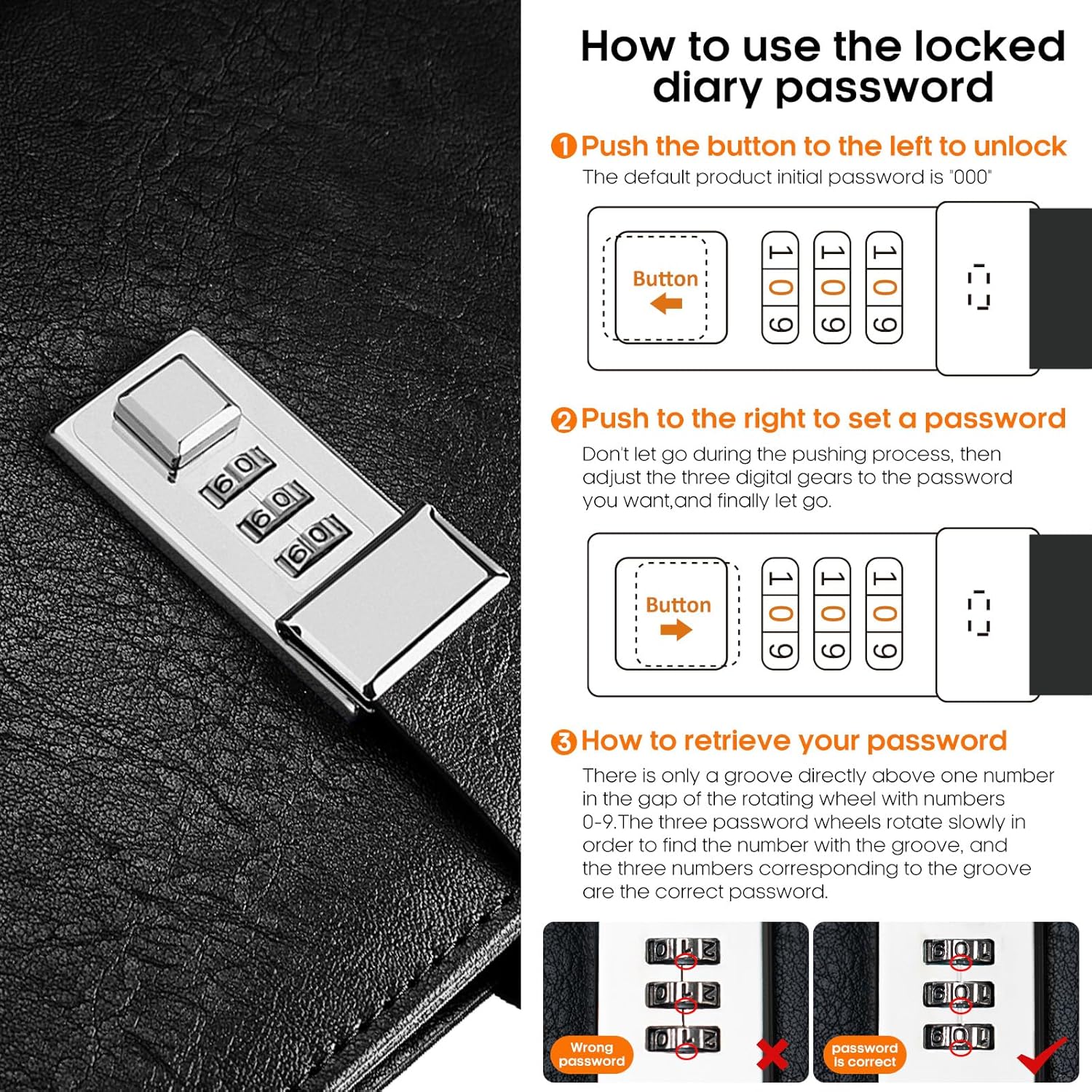 - 【Some Tips About the Lock】The initial password is 000. You can push the block to the left to unlock. If you want to change password, you should push the block to the right and rotate the gear. If you forget the password or can not push the block, you can shine light into the hole beside the gear, and rotate the three gears to align the three grooves in the same horizontal line. The number corresponding to the three grooves are your password.