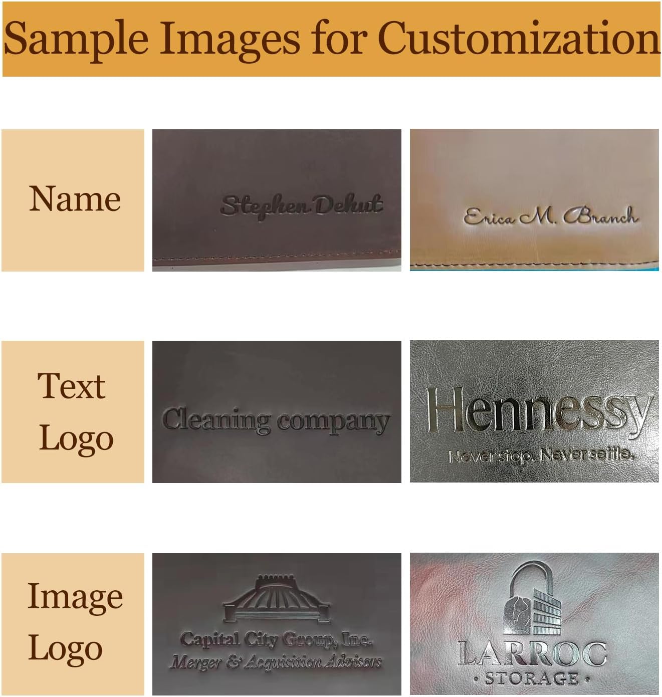 - Personalized Leather Portfolio: You can customize your name, which defaults to the lower right corner, or logo, which defaults to the middle. Simply choose your customization option and input the name or logo. If you have additional customization requirements, such as left-handed people, please feel free to contact us via email after placing an order. We will do our best to assist you. Please note that the image logo is usually debossed and cannot be customized in color.