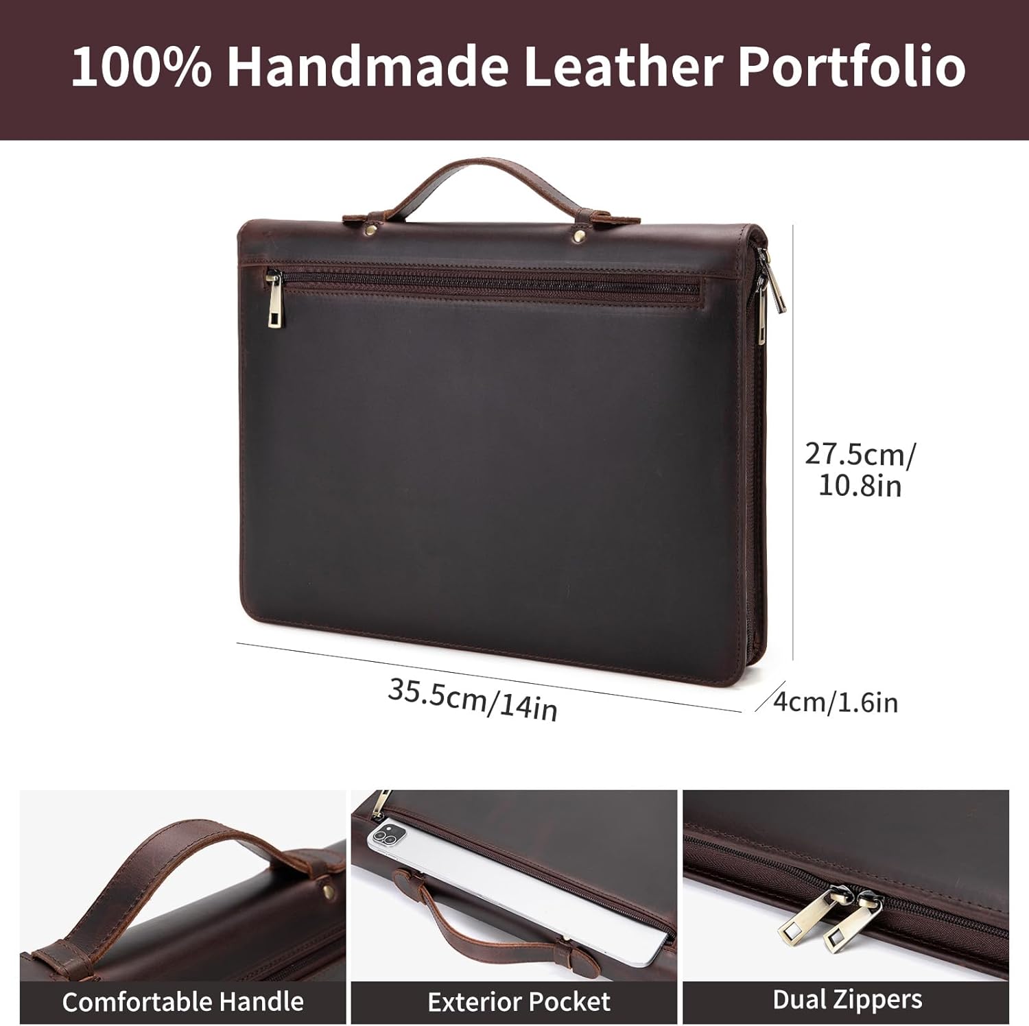 - Enhanced Storage and Convenience: Stay organized with our leather portfolio featuring a dedicated side pocket for tablets or notebooks. Easily access your phone in the specially crafted cell phone holder, and keep your earphones tangle-free in the integrated earbud holder. The portfolio includes an exterior pocket for quick access, a hidden handle for convenient carrying, and a secure dual YKK zipper enclosure to protect your essentials.