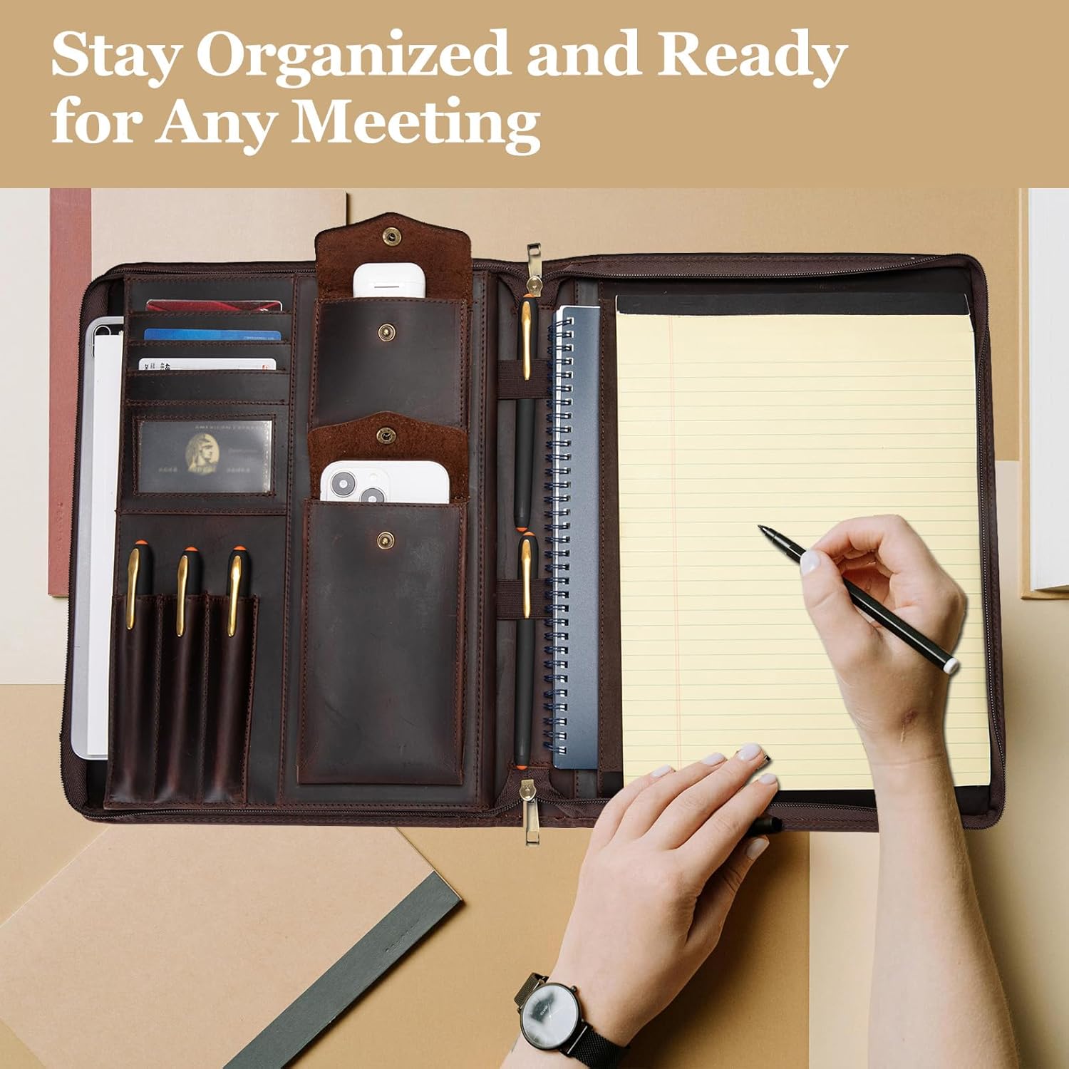 - A4 Notepad and 3 Pens Storage: A perfectly sized holder for Letter Size (8.5” x 11”) notepads. Stay organized and ready for any meeting or brainstorming session with 3 dedicated pen holders, ensuring you always have your favorite writing instruments on hand. Impeccably crafted, this portfolio effortlessly combines functionality and elegance, making it a must-have accessory for professionals.
