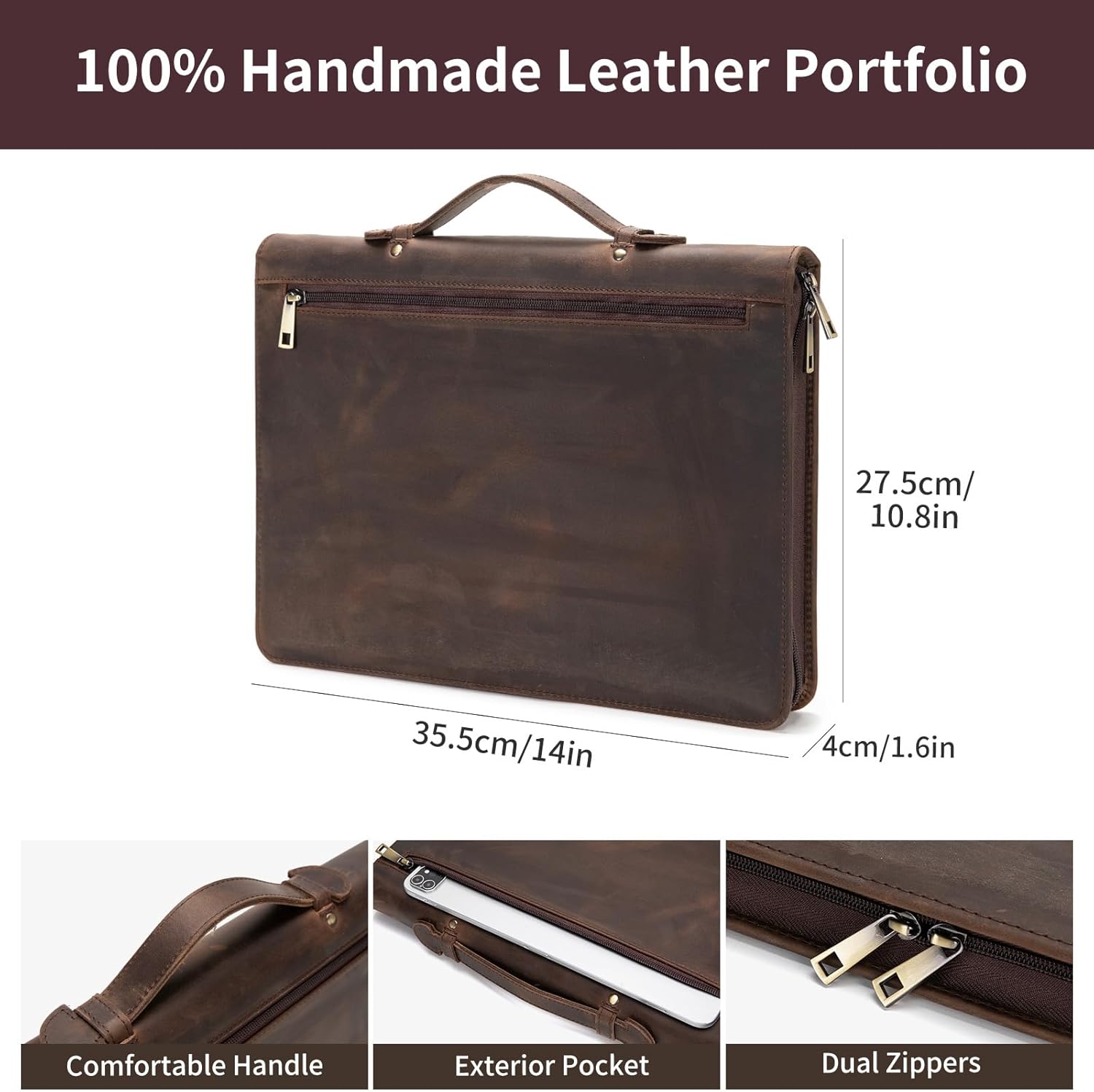 - Enhanced Storage and Convenience: Stay organized with our leather portfolio featuring a dedicated side pocket for tablets or notebooks. Easily access your phone in the specially crafted cell phone holder, and keep your earphones tangle-free in the integrated earbud holder. The portfolio includes an exterior pocket for quick access, a hidden handle for convenient carrying, and a secure dual YKK zipper enclosure to protect your essentials.
