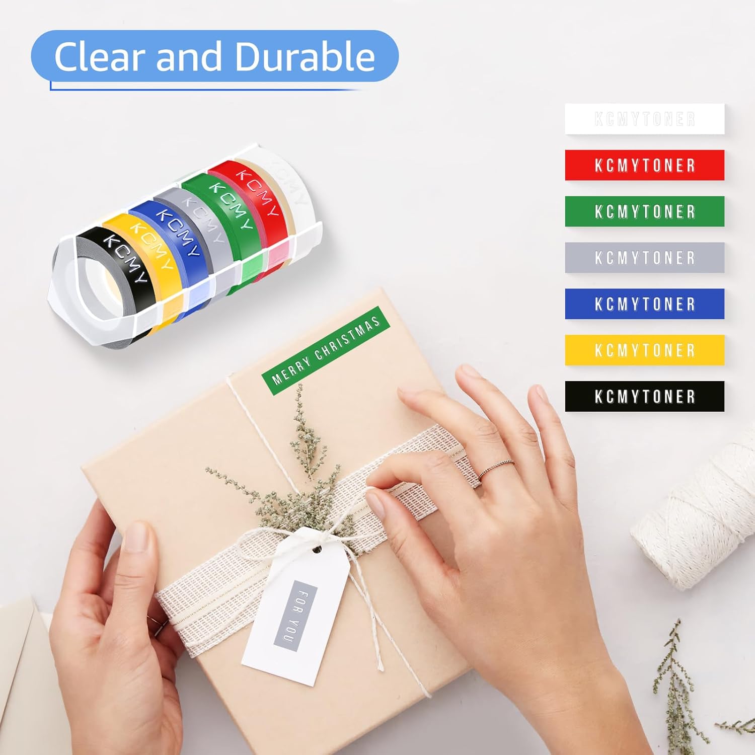 - Product information: KCMYTONER 3D plastic embossing label tapes white print on blue compatible for Dymo embossing label makers. Dimension: Width: 1/2" (12mm), Length: 9.8' (3m).