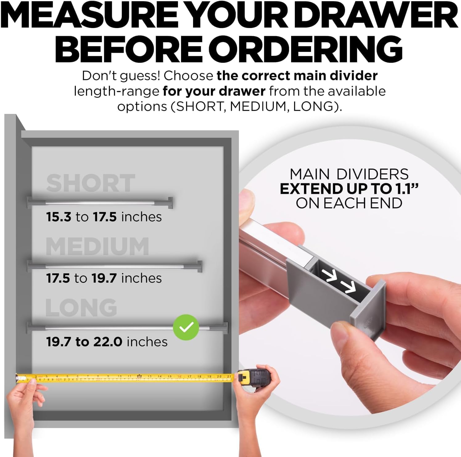 - UPGRADED VERSION 2024 | MEASURE YOUR DRAWER LENGTH FIRST | For the best organizing experience, be sure to measure the depth/length of your drawer (from the front of the drawer to the back) in order to select the correct divider length-range (S/M/L). Ordering the correct size enables you to start decluttering your kitchen utensils, office supplies, junk drawer, utility drawer, crafts, and more sooner!