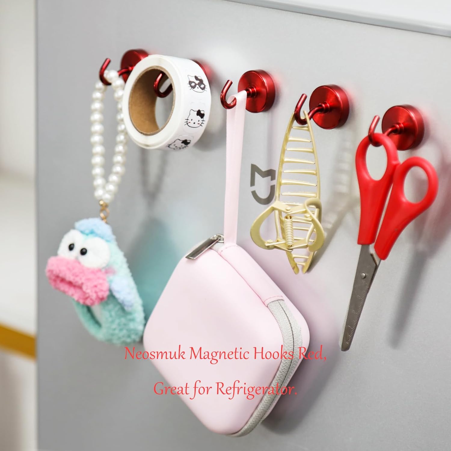 Neosmuk Magnetic Hooks Heavy Duty,Strong Magnet with Hook for Fridge, Super Neodymium Extra Strength Industrial Hooks for Hanging, Magnetic Hanger for Toolbox, Cruise, Grill(Red,4 Pack)