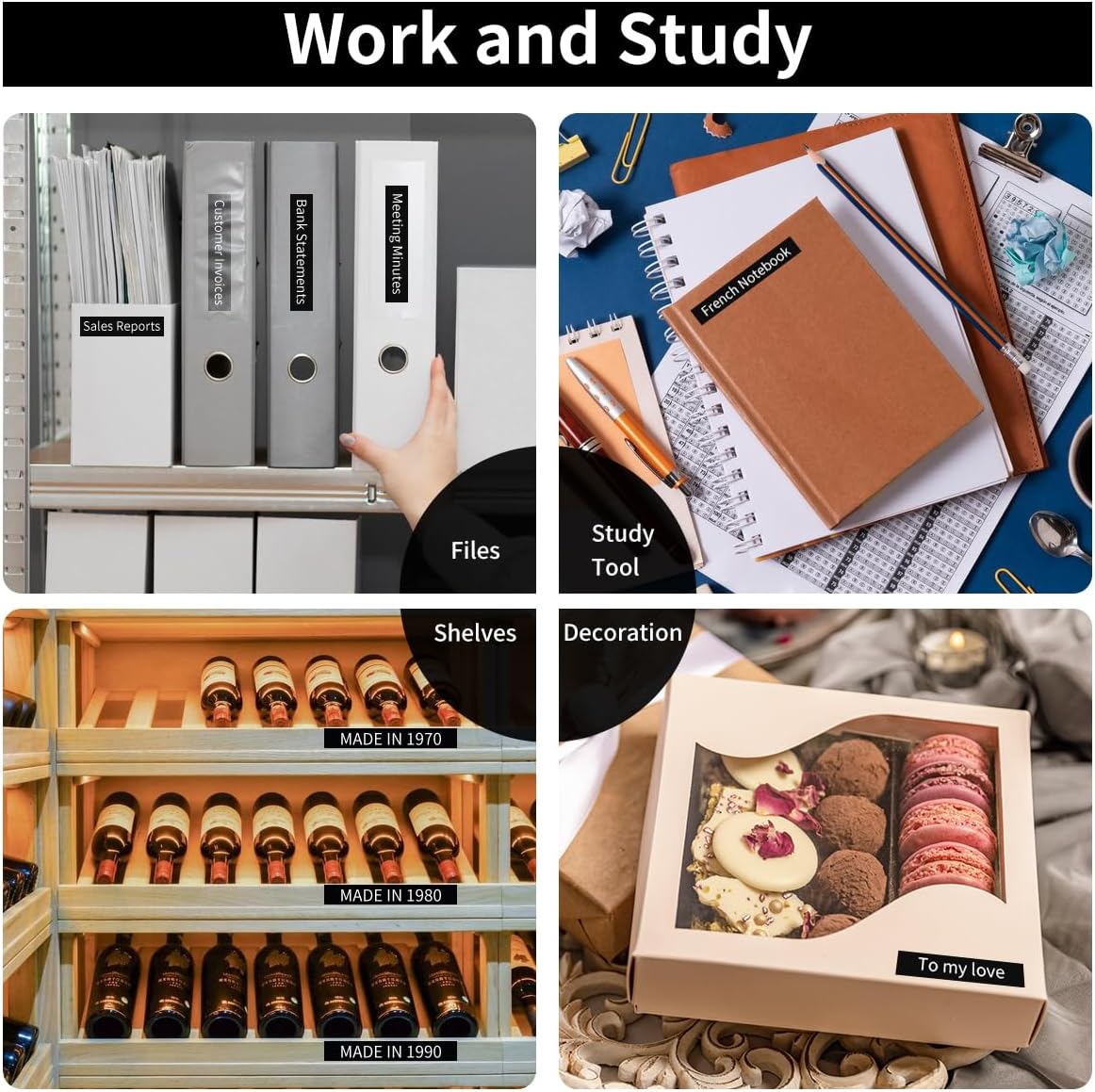 - Meet all label needs: pt-m95 tape white on black tapes are ideal for indoor applications, such as using in school, home, office, hospital and more to mark and classify files and accessories, etc. Quickly organize your home or work space, label containers, supply cabinets, storage boxes, personal items, office files, etc.