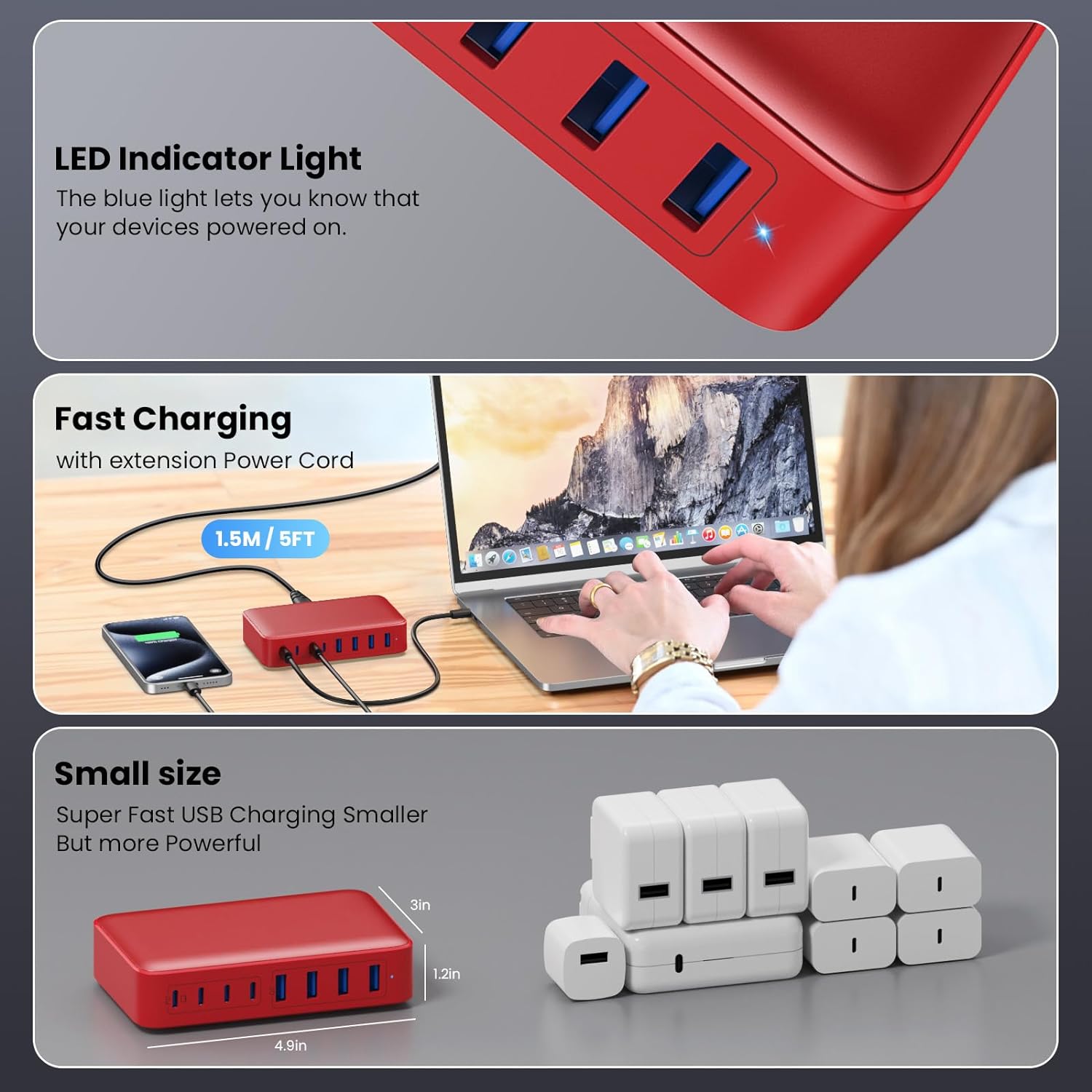 - 【Portable USB C Charging Station Compact and Portable】Multiport USB C Charger Station perfectly charges multiple devices for home, office and travel. Small size saves you 50% space and fits easily into pockets, handbags, travel cases. The 5ft/1.5m power cord for this multiple fast charger station can be extended to the desktop, bedside, counter, nightstand, service desk, etc.