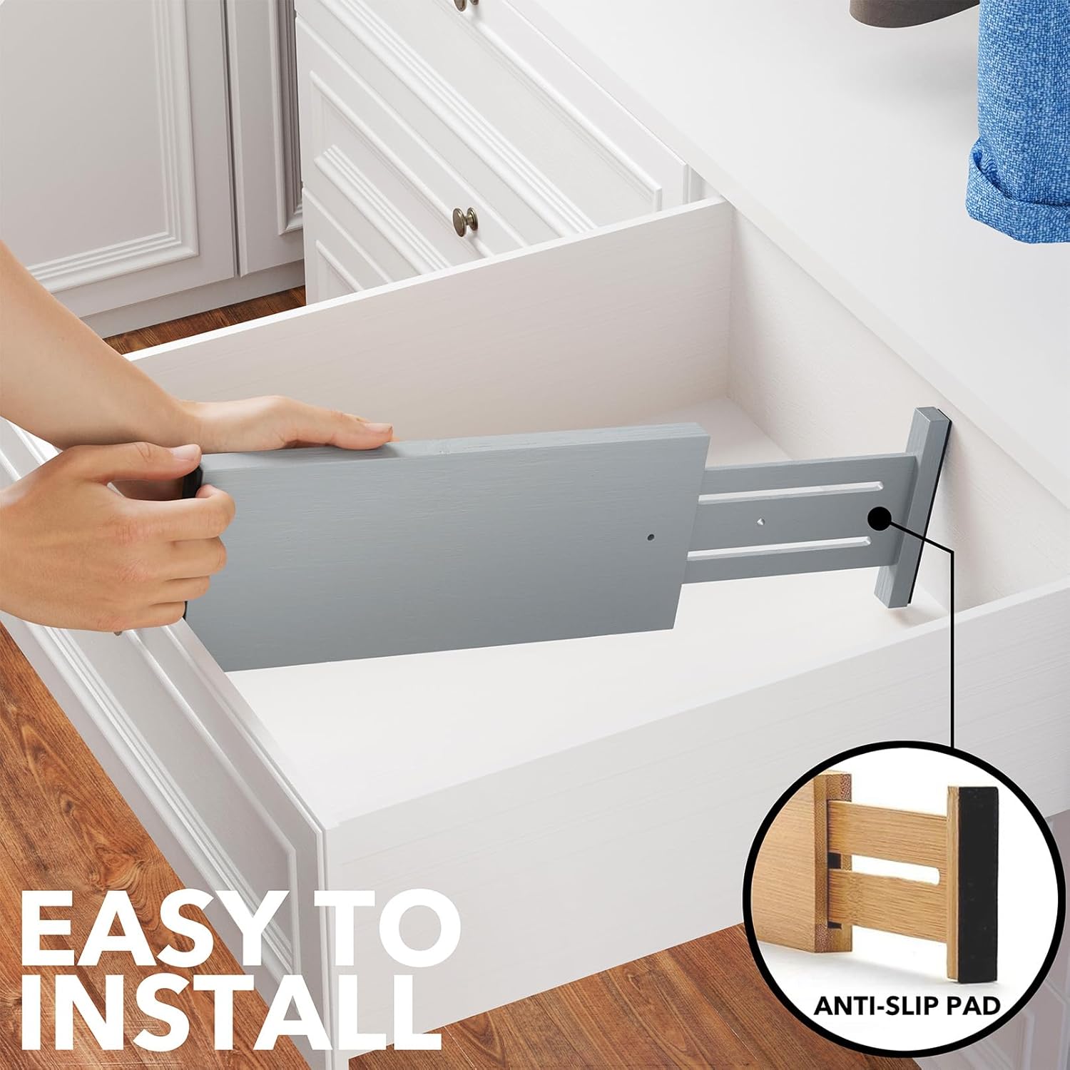 - Drawer Dividers That Stay in Place: Strong spring-loaded design makes them sturdy dividers, with non-slip rubber pads in the end, keeping it stay put all the time and protect your drawers from scratches