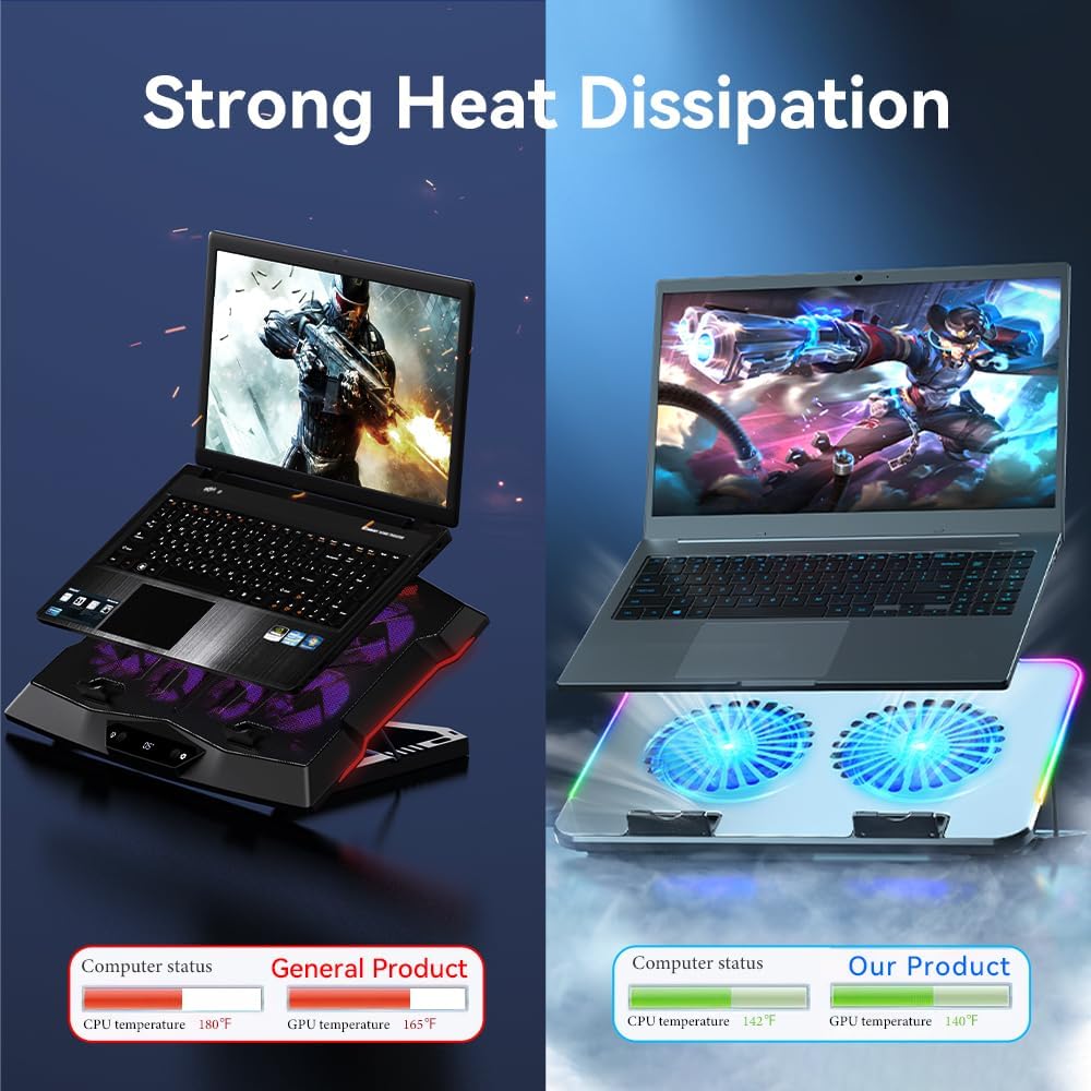- 【Advanced Metal Cooling with High-Speed Fans】 Equipped with two large quiet fans and a full metal panel, this cooling pad provides superior heat dissipation compared to ordinary models. It rapidly reduces laptop temperature, preventing overheating during extended gaming or work sessions.