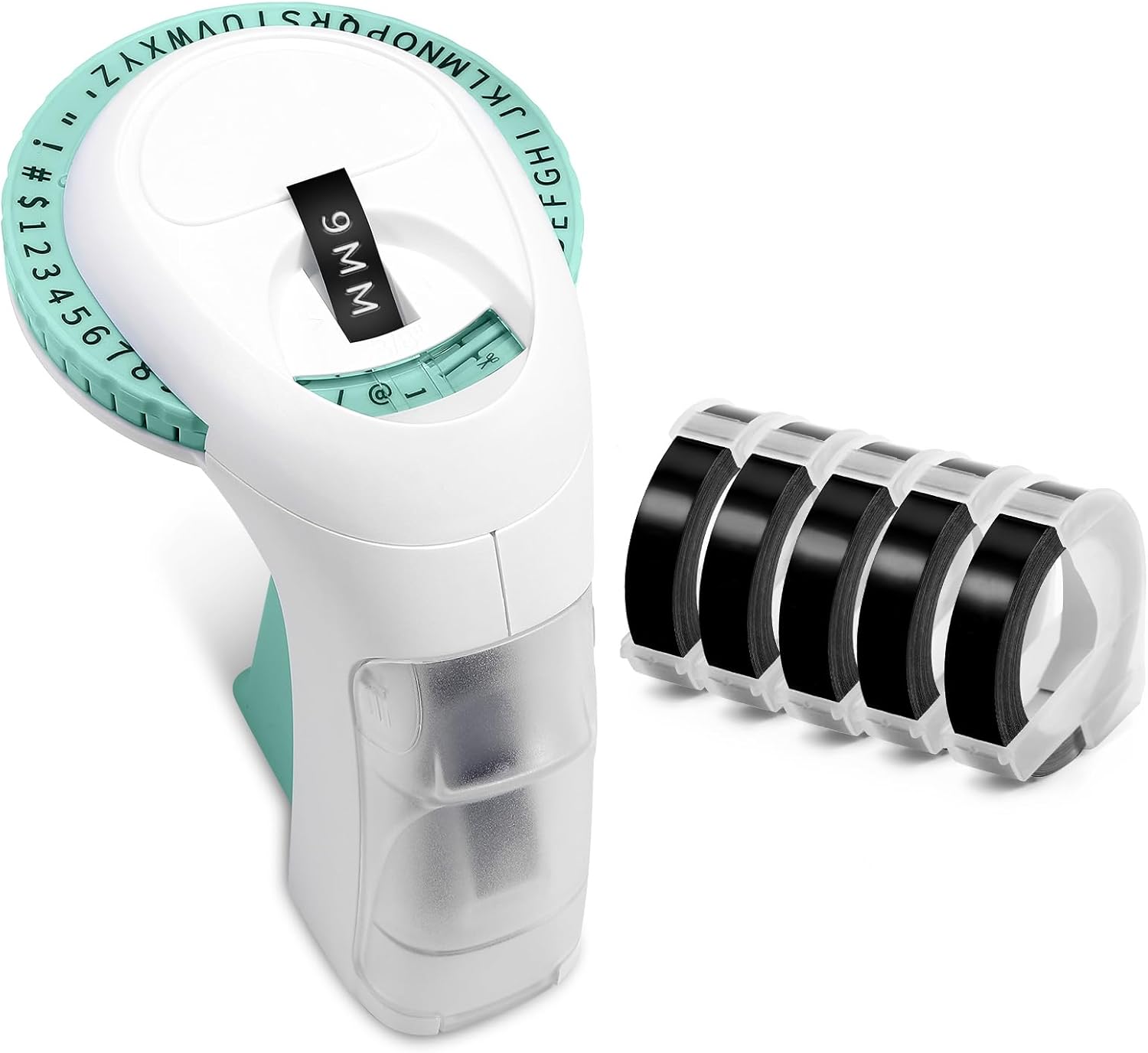 - What's in the package:The handheld green printer comes with a comprehensive set of 5rolls of 9mm (3/8) labeling tape in black. This ample supply of tape ensures you have enough tape for all your labeling needs!When printing, please press and hold it firmly for a few seconds. Because the harder you squeeze, the clearer the letters will print