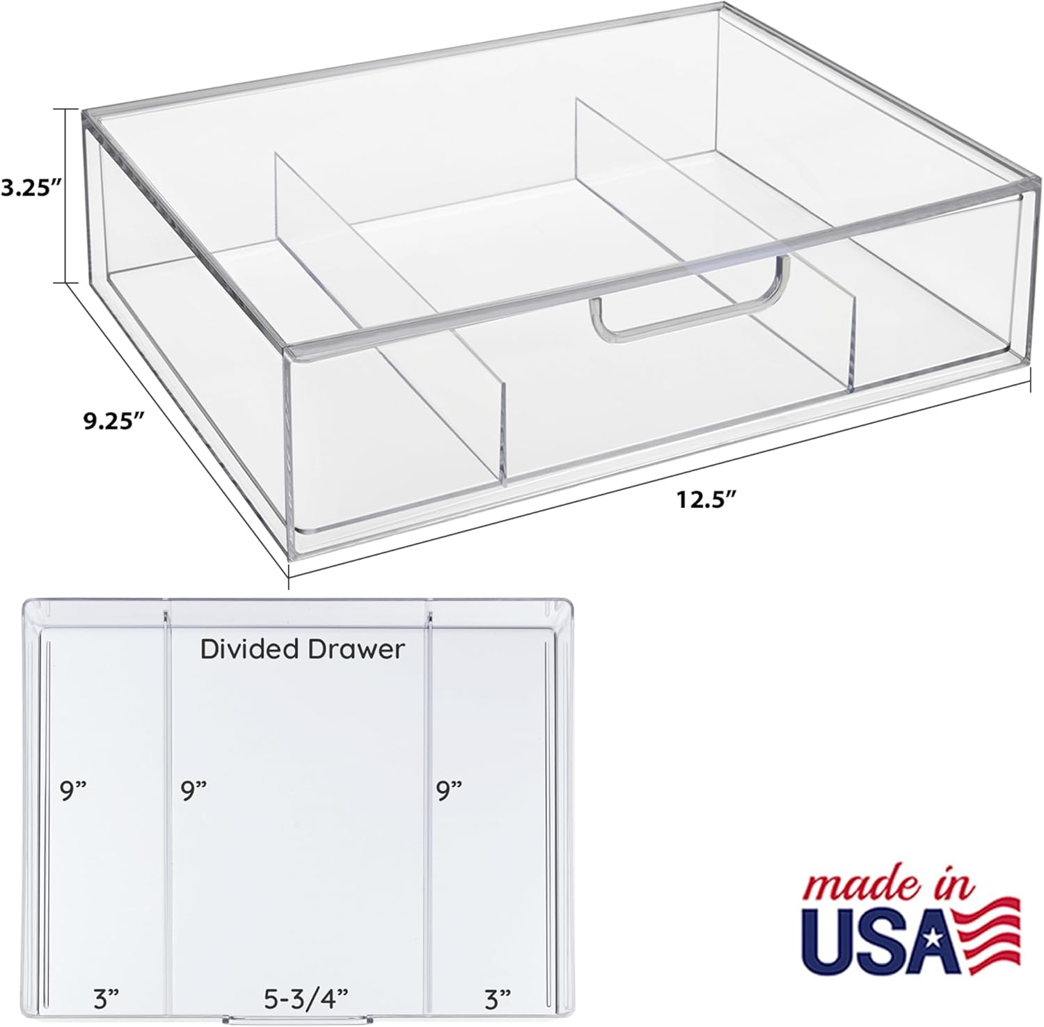 STORi STAX Plastic Stackable Organizer Divided Drawer in Clear | 12.5-inches Wide | 3-Compartments to Organize Office Desk Accessories, Pens, and Notepads| Made in USA